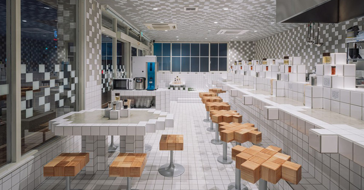 07BEACH使用了常見的白色磁磚、木材、水泥和地毯作為餐廳建材,但是卻以別出心裁的方式將它們組合起來,創造出一個有趣又獨特的空間,像是牆面用灰漿和白色磁磚,排列成波浪狀的麵條圖案,呼應著沾麵使用的麵條,Chikamori表示,如果間隔更遠,圖案會更容易辨認,但這樣會降低視覺上的美感,因此就採用比較抽象的方格圖案,保留一點給大家猜想、好奇的空間。