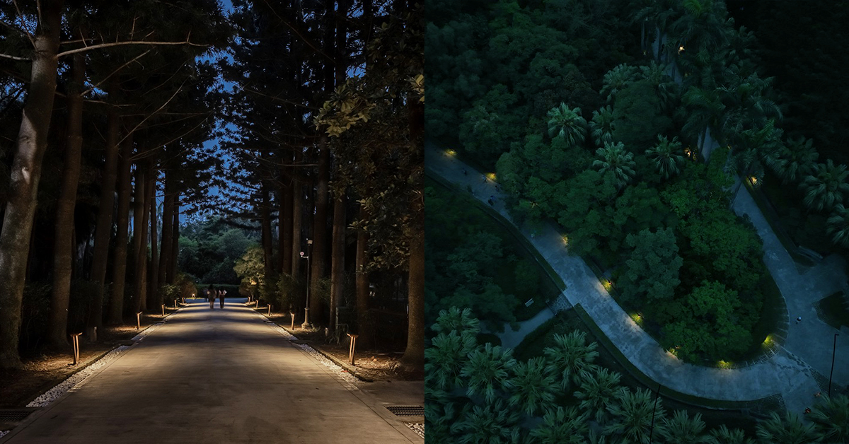 「台北植物園植光計畫」優化植物園和平西路口至博愛路出入口總長約435公尺的步道光環境,在考量園區生態環境前提下進行照明改善,透過減光降低光汙染,並重新設計燈具、調整位置,解決原本照度不均等問題,提供一條讓人們安全穿越植物園的友善步道!
