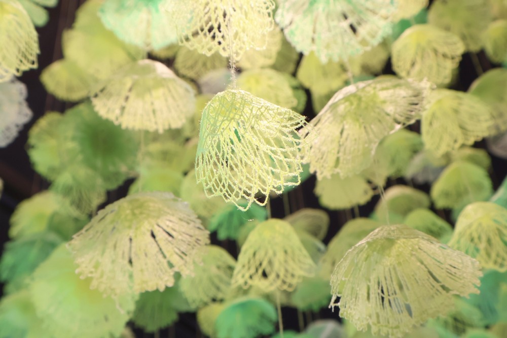 元件造型分別參考絲花、螺旋圖案和海洋生物,再運用對材料和結構的轉化,創造數學幾何般、如抽象花卉的作品。在可溶於水的Solvy布料上刺繡,當作品完成、布料溶解後,原本平面的電繡線條,即轉變成為具有立體感的元件,具細膩的工藝品質感,懸吊於空中成為令人印象深刻的視覺畫面。其中更以「圓」型元件,創造「元、圓、園」的作品語彙,以台元開創精神,圓滿新品牌空間,帶來奇想的雲之花園。色彩方面特別選用純粹、鮮明、具螢光感的色調,以品牌logo之綠色為基底,漸層於多彩的色調變換之中。