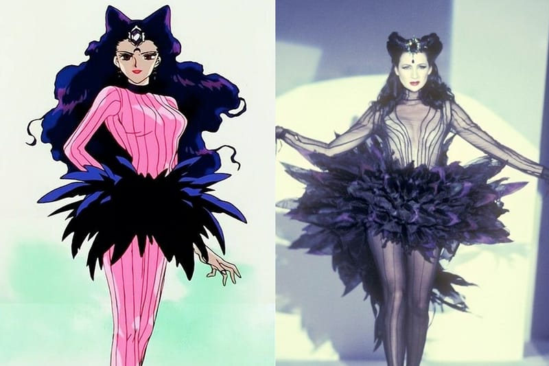 最令當代設計師與時尚評論家驚嘆的,莫過於武內直子對 90 年代時尚尖端的敏銳嗅覺。她大膽地將香奈兒(Chanel)、迪奧(Dior)與聖羅蘭(YSL)等高端時裝元素直接植入角色服裝。例如冥王星雪奈(Sailor Pluto)身上那件充滿權力感與誘惑力的黑金珠寶連身裙,原型便來自 Chanel 1992 年的秋冬高訂系列;而反派「黑暗淑女」(Black Lady)令人屏息的深紅薄紗長裙,則是對 YSL 經典香水「Opium」廣告形象的完美致敬。這些跨界的視覺語彙,讓《美少女戰士》成功跳脫了幼童讀物的層次,進入了成人審美的藝術殿堂。這種將服飾視為戰袍與性格象徵的手法,至今仍深刻啟發著無數設計與時尚創作者。