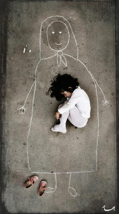 水泥地上有一幅媽媽的畫像,一個小女孩脫了鞋子躺在媽媽的懷裡- – 這是伊朗女藝術家Ba......