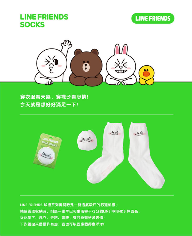 LINE FRIENDS 球襪系列攤開時是一雙透氣吸汗的舒適棉襪 ; 捲成圓球收納時,則是一張早已和生活密不可分的LINE FRIENDS 熟面孔,從此坐下、起立、走路、彎腰,雙腳也有好多表情!