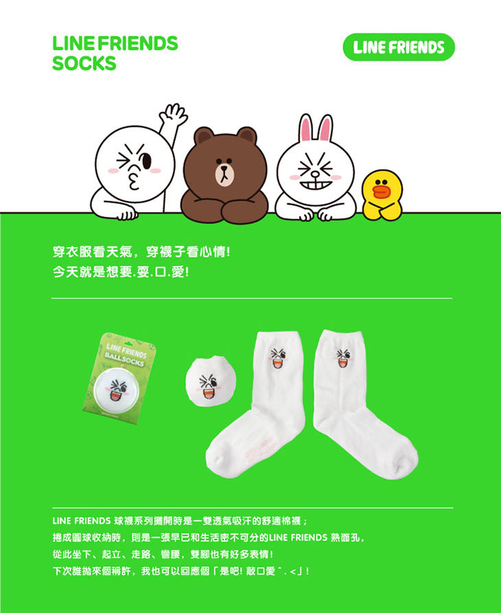 LINE FRIENDS 球襪系列攤開時是一雙透氣吸汗的舒適棉襪 ; 捲成圓球收納時,則是一張早已和生活密不可分的LINE FRIENDS 熟面孔,從此坐下、起立、走路、彎腰,雙腳也有好多表情!