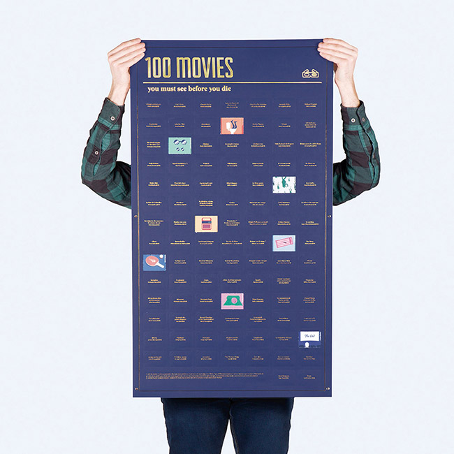 這 100 部電影片單是由西班牙的創意品牌 DOIY 精選出來的,他們設計了一系列「一百件必須在死前完成的 XX 」的趣味海報,除了電影,另外還有事情、景點和美食共四種主題。秉持著品牌核心「 Do It Yourself 」,設計團隊認為好的產品是要讓擁有者參與整個過程,所以他們提供了一個寫滿 100 件事物的清單,再經由使用者實踐完成,讓這張海報成為另一件猶如藝術品、集結 100 個小插圖的畫報。