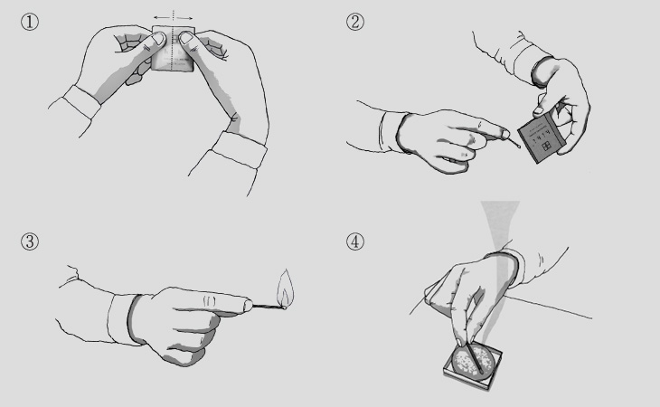 ③ 點燃後請將頭部從水平面略微向下壓,待火焰持續燃燒到薰香火柴部分並自然熄滅。如果在自然燃燒到薰香火柴部分之前將火熄滅,可能會因燃燒不完全而減低香味!
