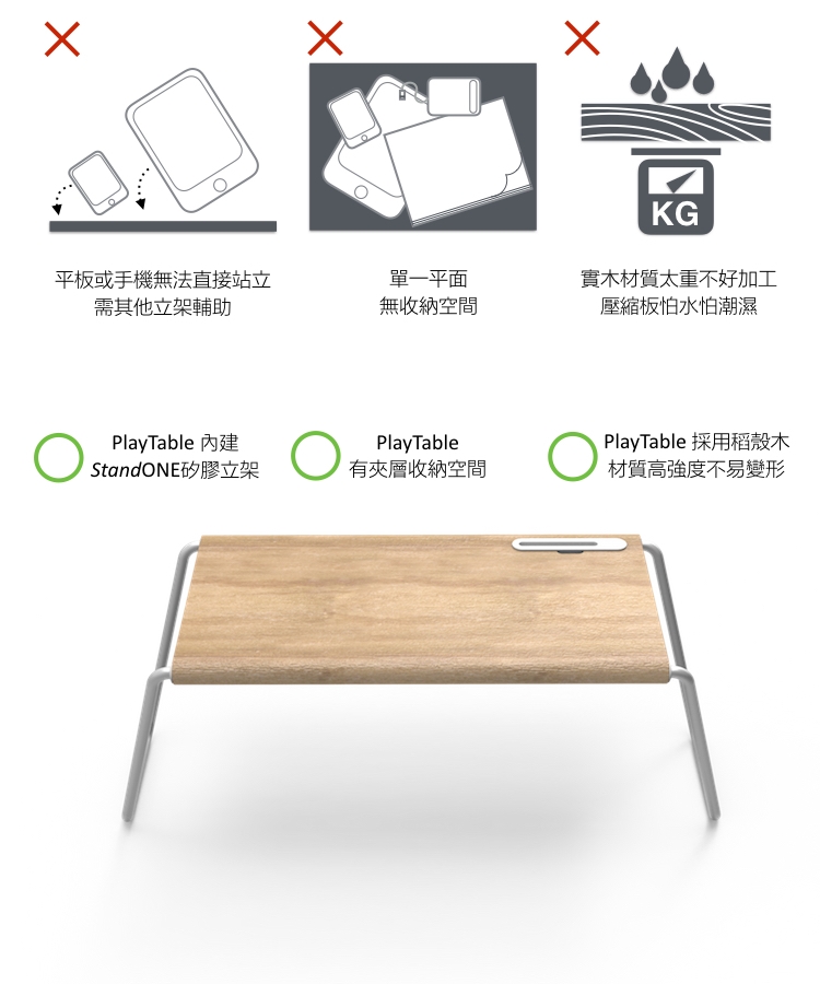商品規格材料: 環保稻殼木,SECC(特殊鋼材),矽膠尺寸(裝上桌腳後): 720 × 270 × 260 mm尺寸(裝上桌腳前): 500 × 270 × 28 mm內部可容納尺寸: 500 × 225 × 20 mm重量: 2.5kg可承受重量: 5kg商品配備行動桌板 x 1 / 腳架 x 2 / StandONE x 2備註腳架在安裝、拆卸的時候,請兩隻腳『同時塞入』和『同時拆下』避免因為先拆或先裝一邊而造成桌板破裂喔! -