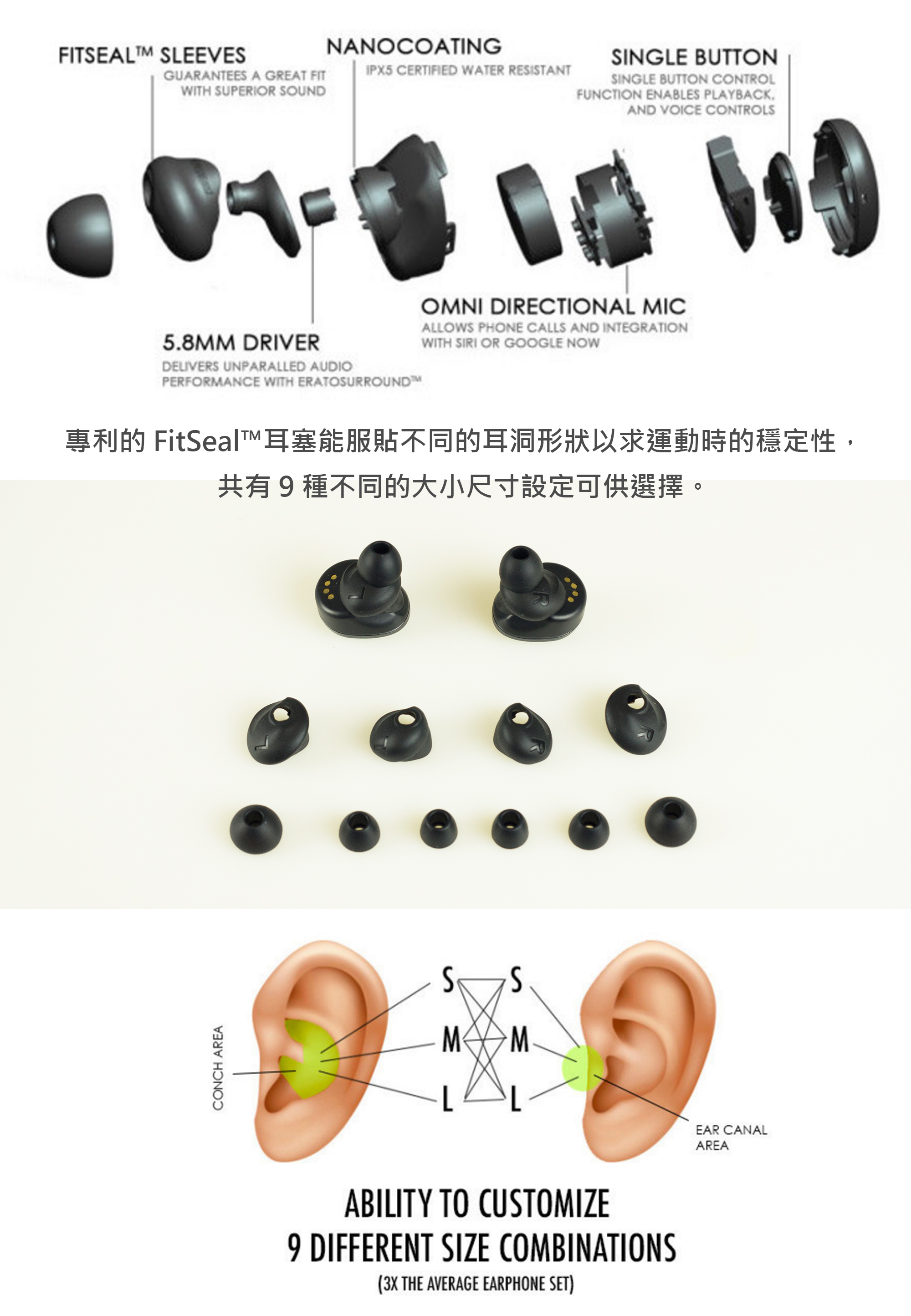 耳機一對、充電盒、充電線、耳塞*4對、FITSEAL固定器*3對、說明書