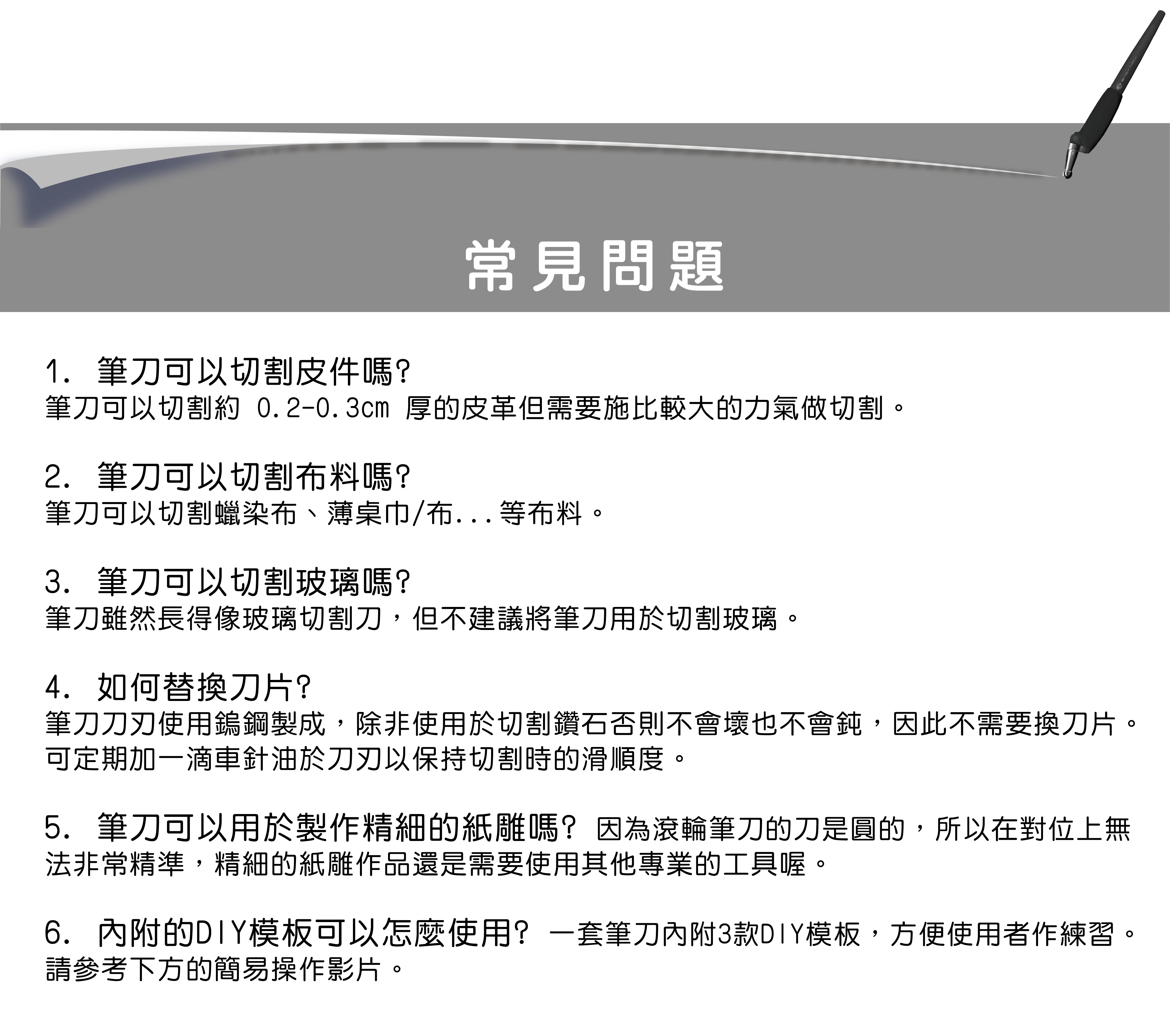 A:用肉眼看應該也可以看出筆刀的滾輪直徑大約只有 5mm,一般的紙張、布料、衛生紙、塑膠袋等等,只要在 150 磅內(約兩張 A4 紙厚度)都可以順利的切割,太厚的紙或材質因為刀片的寬度和筆頭的厚度,要切割是比較困難的。