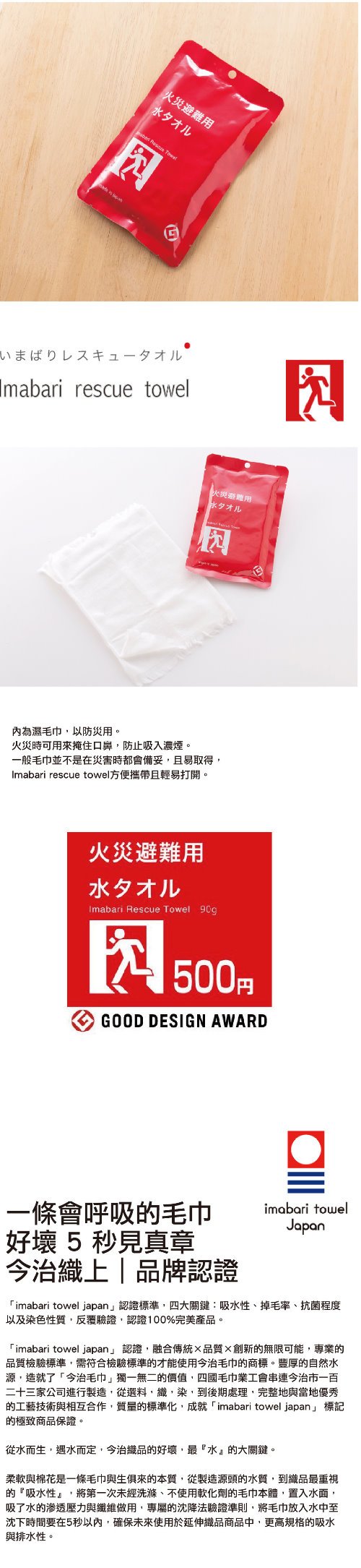 在日本每年有超過2000人在火災中喪生,這時常是因為在火災發生時,恐慌使人心中只有逃生出口卻忘記要去洗手間拿毛巾沾濕並嗚住口鼻,在反覆用耐久性測試八年後,宮崎社長改用鋁袋包裝並開始販售rescue towel,這個產品的目的,單純是為了保護很多人的生活,即使是一個人的生命,也希望能有所幫助。