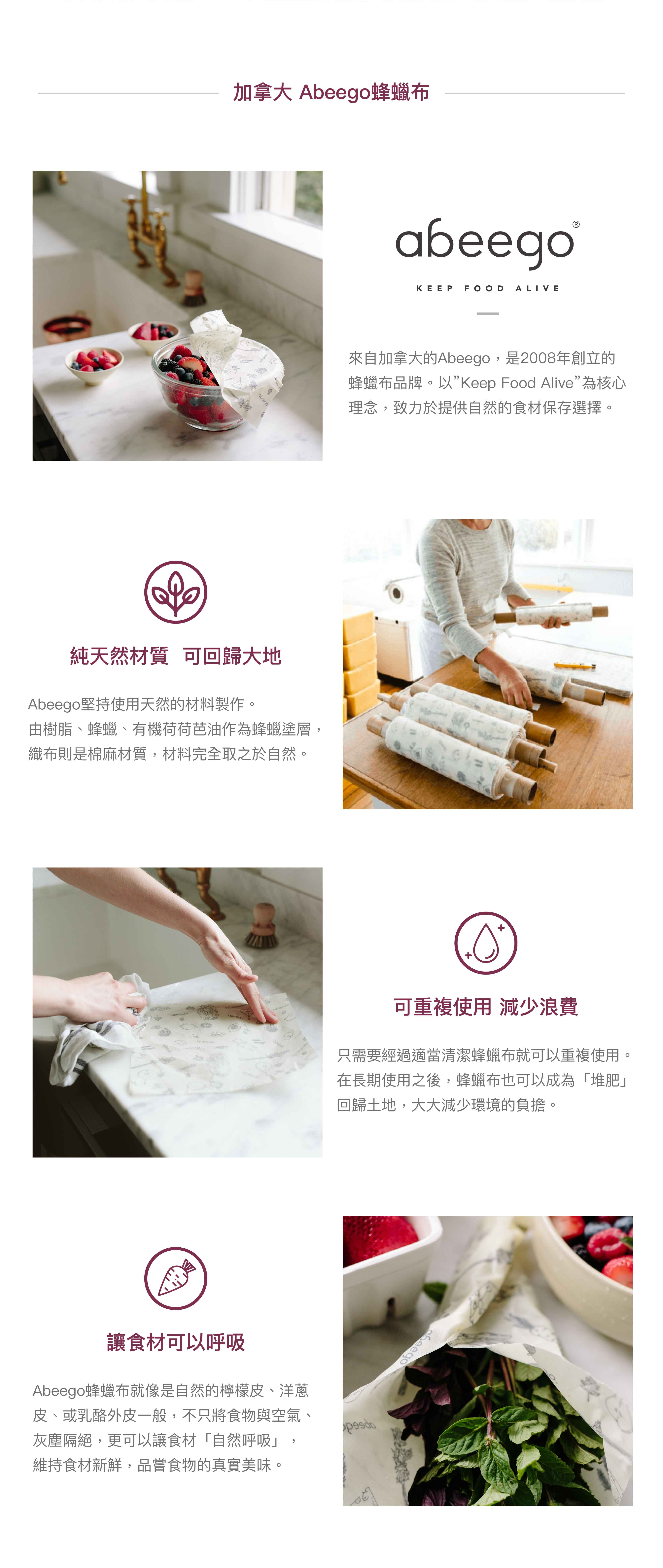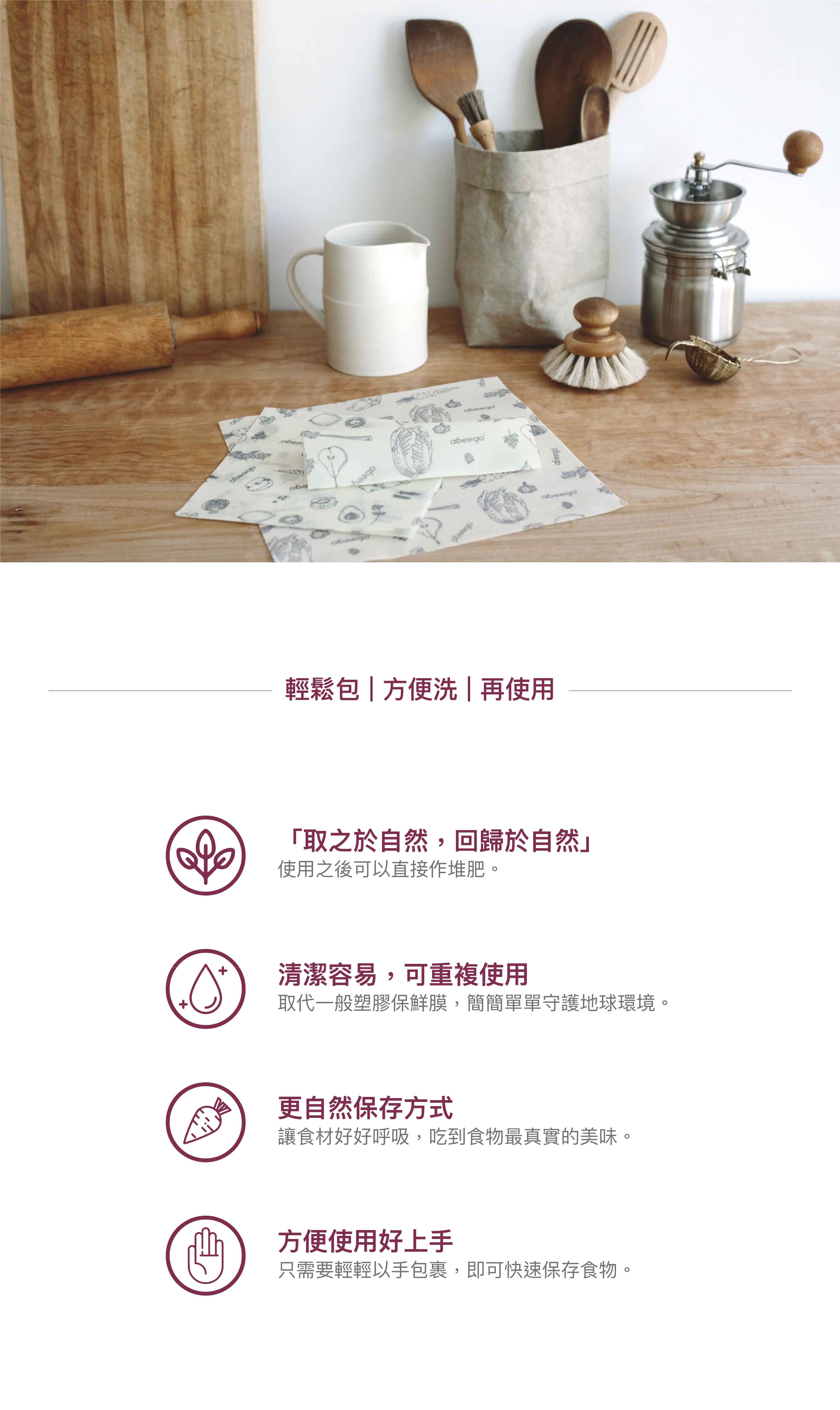 商品規格品名:Abeego 蜂蠟布-小塊兒尺寸:18 x 18 cm cm;六入材質:樹脂、蜂蠟、有機荷荷芭油、棉麻織布產地:加拿大保存:未開封蜂蠟布約可保存3至5年注意事項蜂蠟布需使用冷水手洗,不能扭轉擰乾建議使用「無酒精、自然有機」的用品清潔污漬、染色和摺痕都是正常反應請遠離熱源與火,避免蜂蠟和樹脂融化可適時修剪邊緣,但盡量不要大塊裁切蜂蠟布使用前不需要沾水,用手即可讓蜂蠟布附著備註為了讓您的Abeego 蜂蠟布可以增加使用期限,她會需要您的細心與呵護!每張未開封的Abeego蜂蠟布約可保存3至5年,而使用中的蜂蠟布如果好好保存,是可以使用長達一年以上喔! -