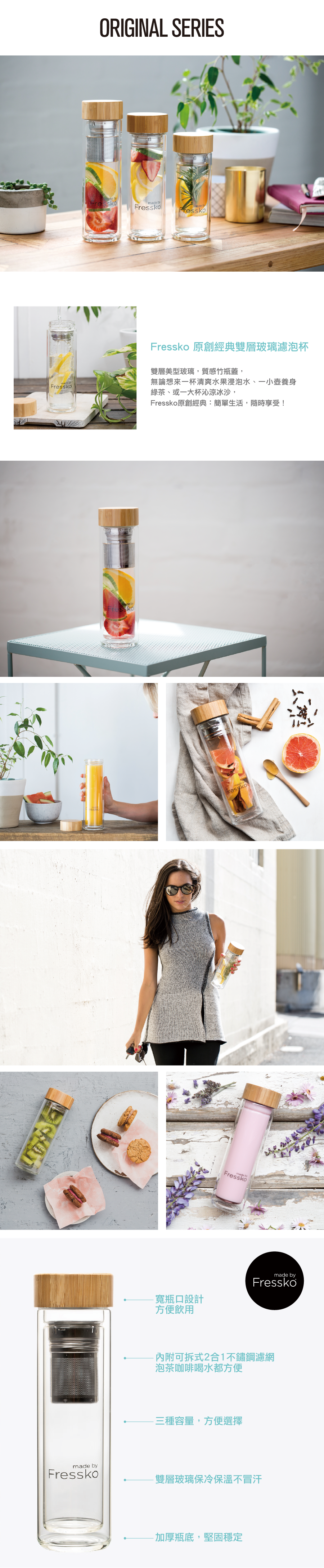 Fressko | 品牌故事「善待地球、善待彼此、善待自己!」是Fressko最簡單的起始。從澳洲開始,Fressko將簡單、永續、無痕融入生活中的每個角落。不論是泡茶、沖咖啡、製作水果水,Fressko用心於隨行濾泡杯的每個設計環節,以玻璃、竹子、不鏽鋼為主要材質。期待在提供更佳的飲用經驗外,更成為友善環境、永續生活的好選擇。