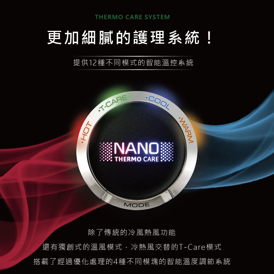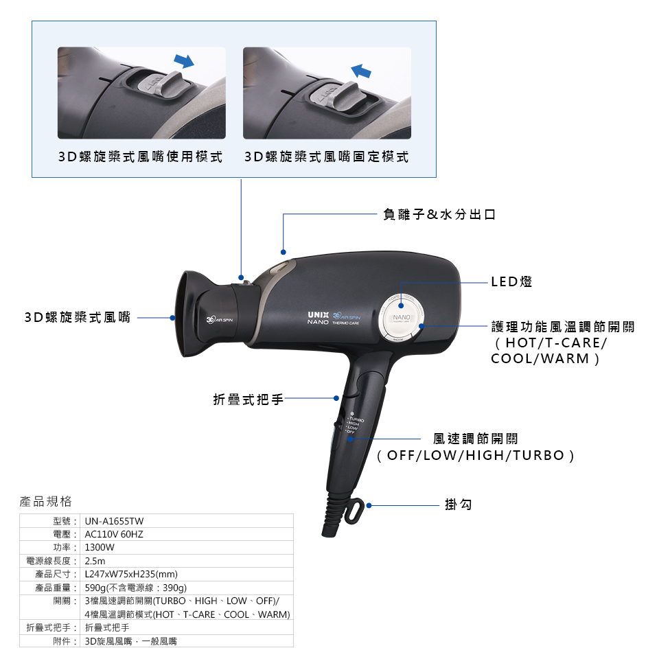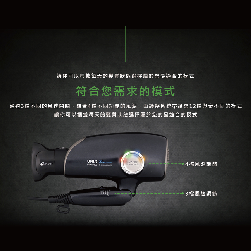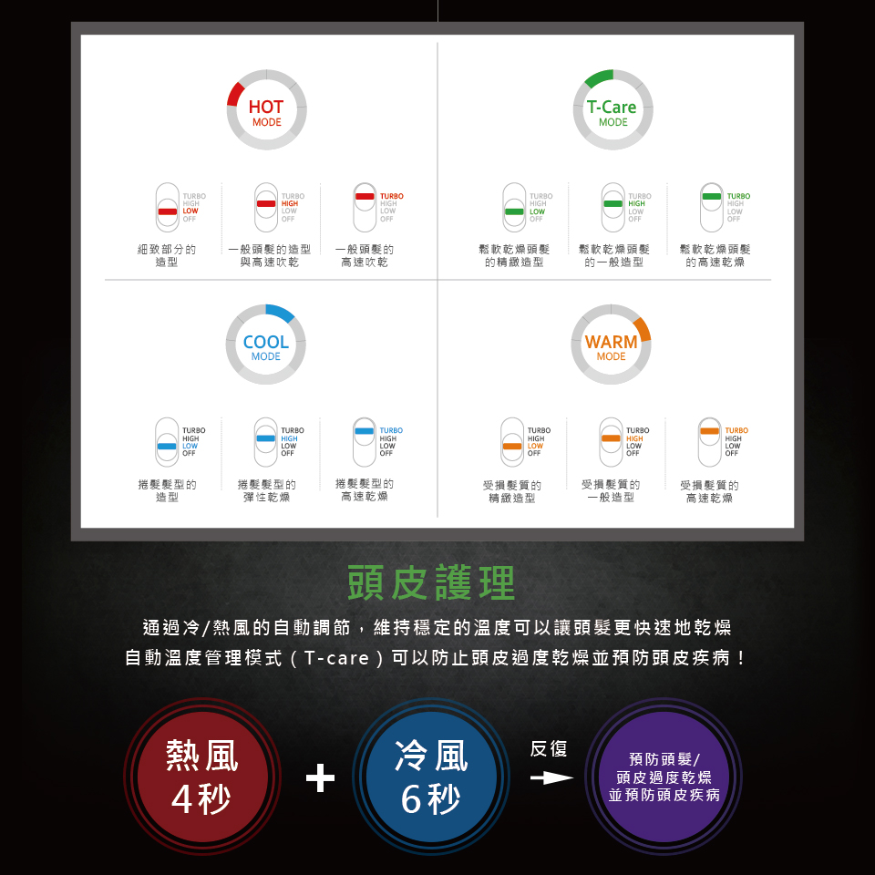 - 熱度及風力綜合共12種模式,各式髮質皆適用