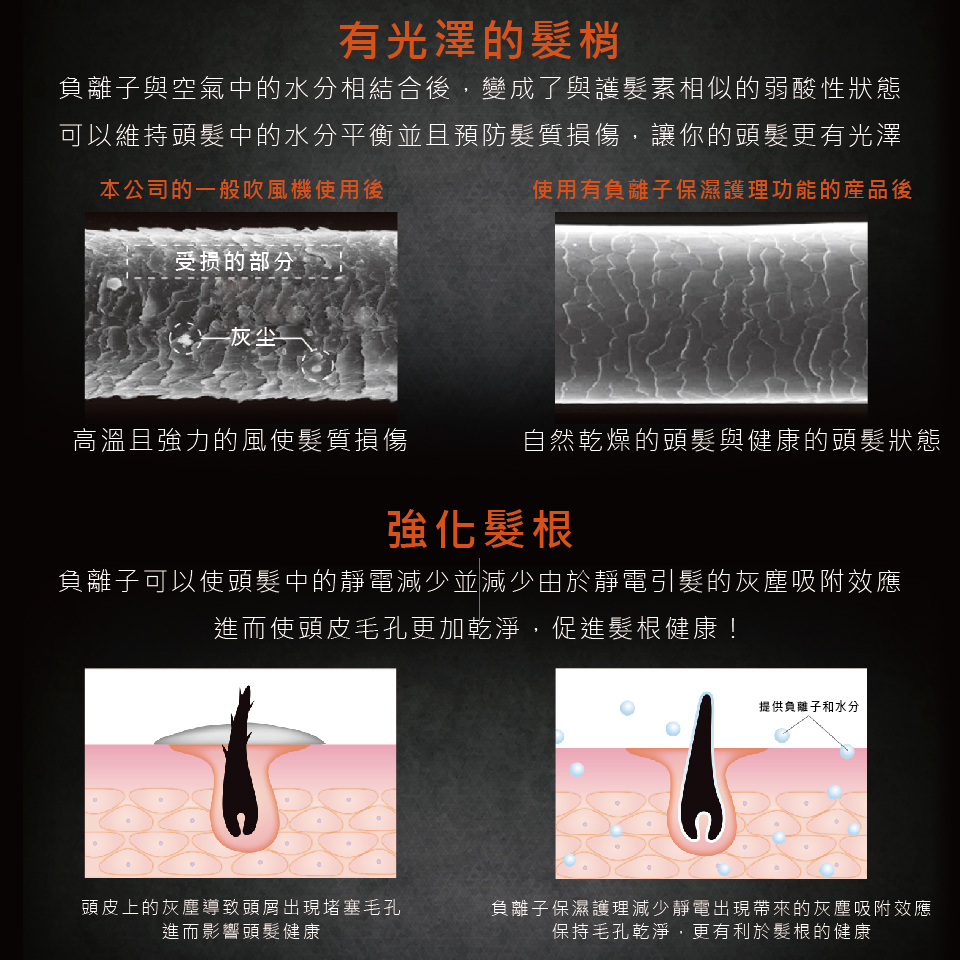 - 奈米負離子減少靜電和粉塵形成,保持毛孔清潔