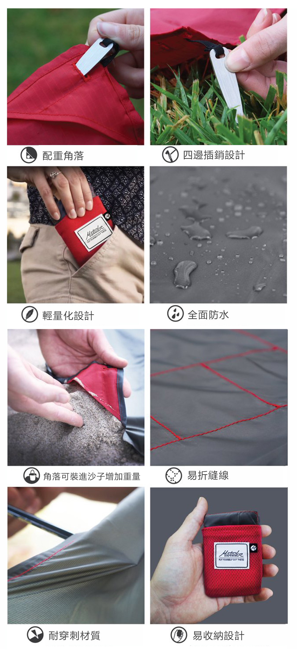 Matador 戶外多功能墊不僅只是一塊野餐墊如此簡單,以特殊的輕量防水纖維 HyprLyte Nylon 織成,可抵擋草地濕氣,甚至避免海灘上的水氣透進毯內。即便厚度僅有 90 微米,戶外多功能墊的具備的高防穿透力,更不用擔心會被野外樹枝、海灘砂石等尖銳物穿刺。