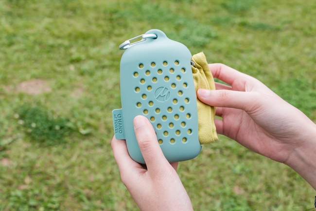剛使用完一身濕的速乾毛巾,暫時找不到地方掛,能將毛巾收納進小巧耐看的矽膠收納外盒,並直接掛在包包外頭透氣通風,更節省行李空間。