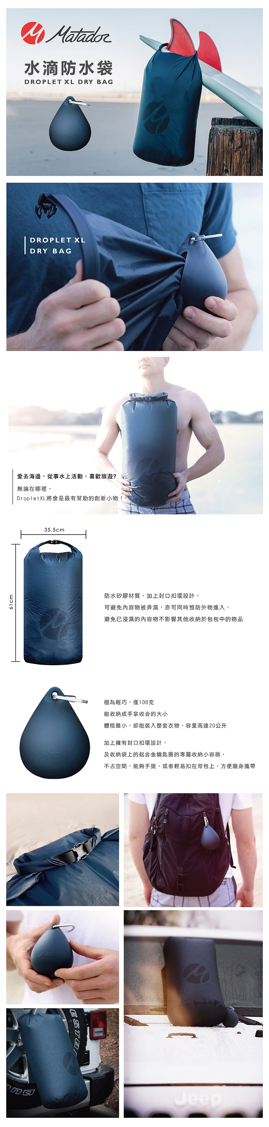 不論你是露營、玩水、野餐、登山…就連參加音樂祭,上山下海任一處,Matador 都能陪伴你。出門不用再為了大包小包煞費苦心,更減輕你旅途中的行李負荷,因為全部都幫你把體積縮到最小、最輕啦!你的心神只需浪費在戶外玩樂這件事就可以!!