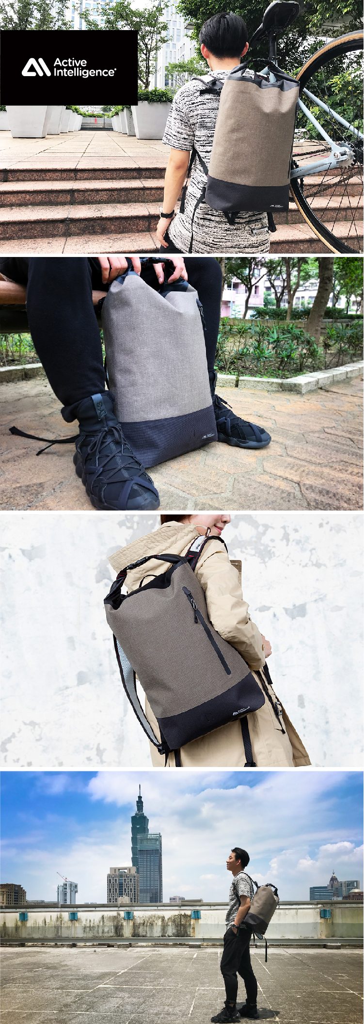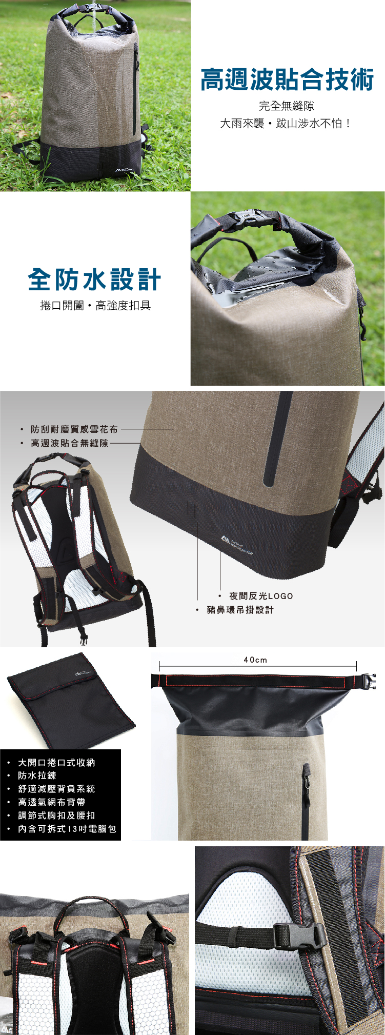 產品介紹在城市中,不論是喜愛單車運動或是有每天騎車通勤需求者,也許都會期待擁有一款便利、有型、且具備機能實用,能完美貼近個人生活習慣使用的包款。尤其戶外運動或通勤,最怕那突然來的一陣雨,弄濕了包內重要的物品或電子設備。 Active Intelligence的包款,能讓你不受天候限制,不論在車水馬龍的城市當中,或是氣候嚴酷的戶外探索,都能夠毫無負擔的攜帶隨身物品並更自在的享受生活!專業防水輕量後背包,獨特一體成型輕量化空間設計。高週波貼合全品無縫隙,加上無滲水拉鍊,達高度防水性。使用1000丹的防水及防刮耐磨質感雪花布,及高透氣網布背帶及背墊,透氣透濕性佳、抗菌、易去汙,耐用舒適,適用各種戶外運動及都會休閒場合。Active Intelligence,戶外界的新銳品牌,在上市後短短兩個月內先後獲得德國iF DESIGN的國際創新設計獎以及上海國際自行車創新獎,並在一年內迅速拓展至日本、新加坡、英國倫敦及美國紐約市場。如同Beyond The Standard不斷的超越標準的品牌精神,Active Intelligence在包袋的製作上,以戶外最高防水機能需求為標準,使用極致的高週波貼合技術,每一個包款手工調整貼合,打造出完全防水的無縫包款。這次要推薦Active Intelligence的後背包及郵差包,每一個包款都是採用1000丹的防刮耐磨質感卡其色雪花布,質感似硬挺牛仔布料,且耐水壓達10000mm以上,加上耐磨尼龍布,輕量化一體成形,同時以拼接方式打造出機能兼具的都會休閒風格。使用說明清洗、保養、使用建議• 保持乾燥,存放於通風清涼處• 不可機洗、不能漂白、不能熨燙、髒污時以濕布擦拭• 若防水包淋濕用乾淨棉布將水分擦乾• 放通風處自然風乾,以防留有污漬或浮水印• 弄髒的防水包要清潔乾淨再收納,並遠離高溫及潮濕環境• 勿將任何重物放置拉鍊的上方,防止拉鍊變形損壞商品規格產地:台灣/中國保固:一年材質:雪花布、尼龍布、TPU尺寸:37X12X44CM重量:800 G內容物:內含可拆式13吋電腦包 -