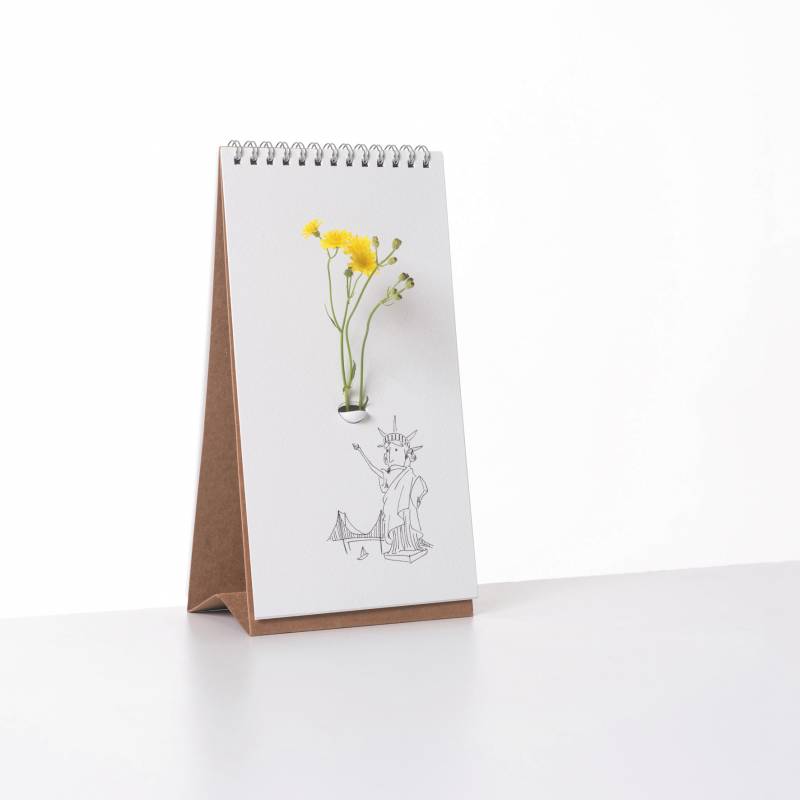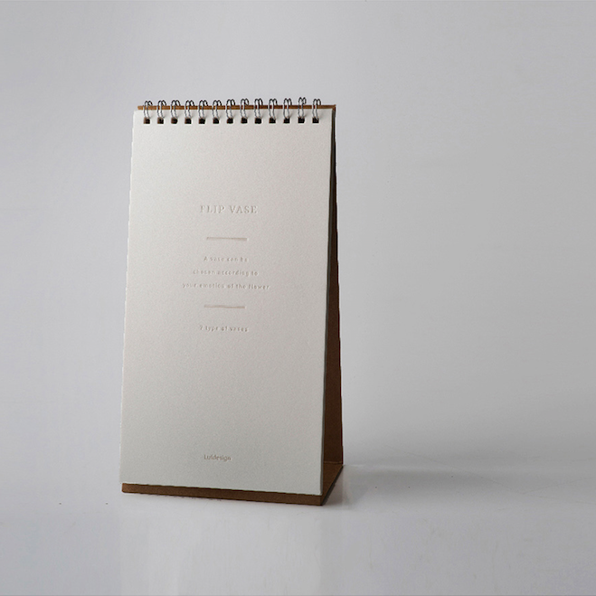 翻頁花器是設計團隊突破框架,結合翻頁書和花瓶的作品,外觀看起來就像是一本桌曆,一頁一頁有著優雅的花瓶或人物插畫,但它卻有著一個能夠固定於翻頁書的花瓶,使用者可以將花朵插進這瓶容器中,再以心情翻動印有圖騰的書頁,搭配出不一樣的花花世界。