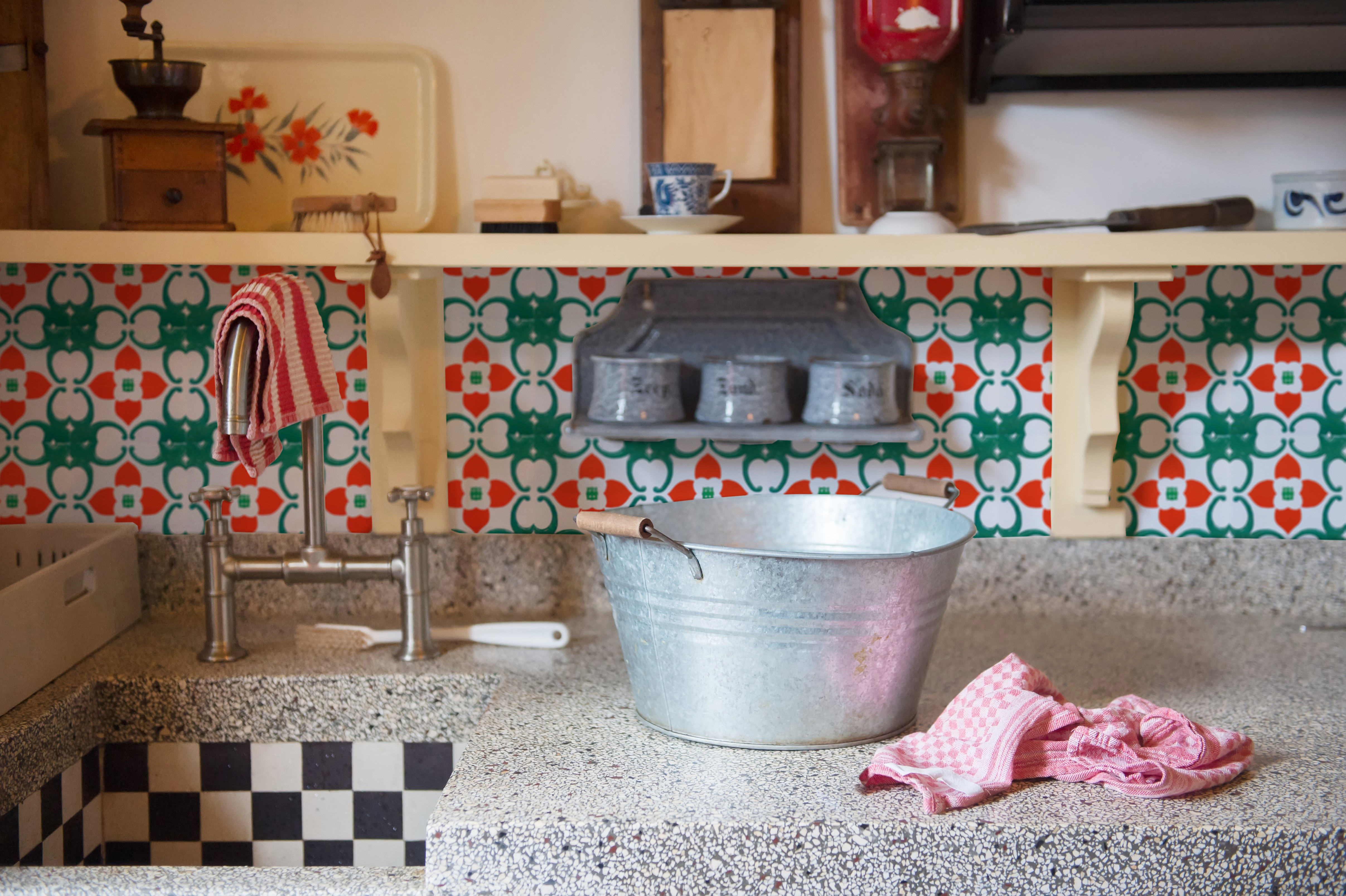 化妝前要先洗臉,改造也要先清理一番(媽媽表示順便大掃除好開心)!編輯選用了象徵事事如意的滿堂紅花紋,希望吃了在廚房做出來的菜都能事事順心!清理完廚台的牆面之後,將鎖在牆上的雜物架拆卸下來,就可以貼上花磚貼紙了,遇上障礙物的話,貼紙還可以修剪成符合的形狀,貼完之後新的廚房就閃亮登場~