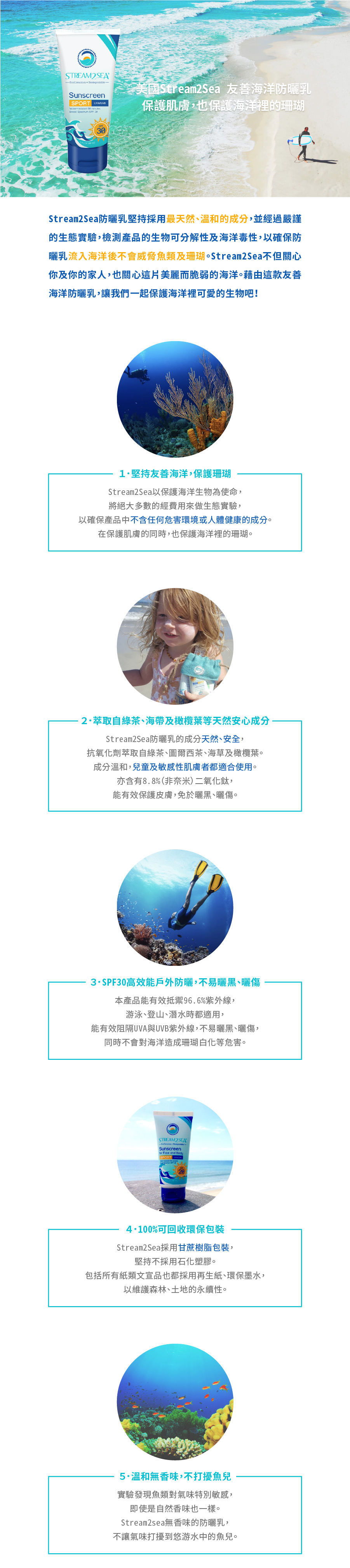 美國 Stream2Sea | 品牌故事專為友善海洋打造的防曬乳,保護肌膚,也保護海洋裡的珊瑚!來自美國的Stream2Sea,每一個成員都是熱愛地球、勇於冒險的探險家,酷愛潛水、划船、徒步旅行、露營、滑雪……等。然而,在我們快樂探險地球的同時,海洋裡的珊瑚卻在哭泣,因為我們身體上擦的防曬油會危害他們的生命。身為探險家,Stream2Sea 以保護海洋生物為使命,將絕大多數的經費用來做生態實驗。Stream2Sea嚴格控制產品中的每一種成分,採用綠茶、圖爾西茶、海草及橄欖葉等原料,極力打造出一系列專為友善海洋設計的防曬保養品,在保護肌膚的同時,也保護美麗的珊瑚。別讓有毒成分傷害我們的海洋很多人一定會很驚訝,其實防曬乳中的許多常見成分會毒害珊瑚礁。已有許多研究指出,我們身上擦的防曬乳流入海中,會直接導致珊瑚礁減少。據統計,每年因遊客水上活動會有6,000 至14,000噸的防曬乳流入海洋接觸到珊瑚礁,加速珊瑚白化。因為意識到防曬乳對環境的影響,Stream2Sea決定為地球做些改變。