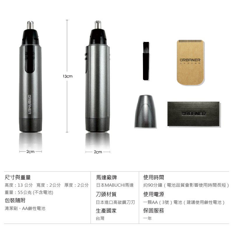 尺寸:13 公分x2 公分x2 公分材質:日本進口高碳鋼刀刃規格:MB-041 奧本水洗式電動鼻毛刀包裝服務:無 -
