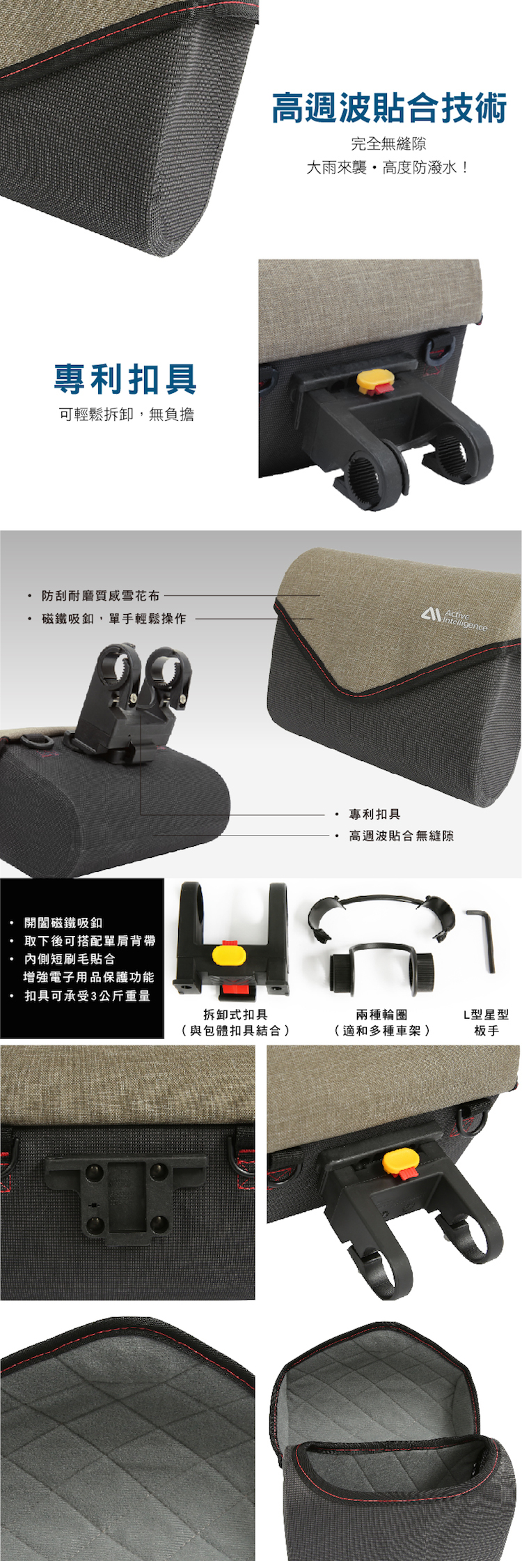 時尚簡約外型,藉由專屬扣具的巧妙安裝,如同前鋒般的安穩置於單車把手的前端。磁鐵吸釦開啟容易,方便隨時拿取常用的隨身小物。