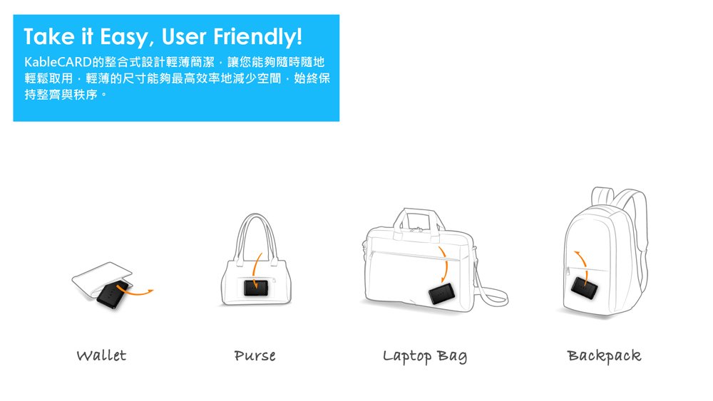 CARD 的設計理念為"Compact And Revolutionary Designs" 也就是精簡尺寸、功能豐富並具革命性的創新設計。這次在有限的空間內,我們希望賦予 KableCARD 七大設計特色。