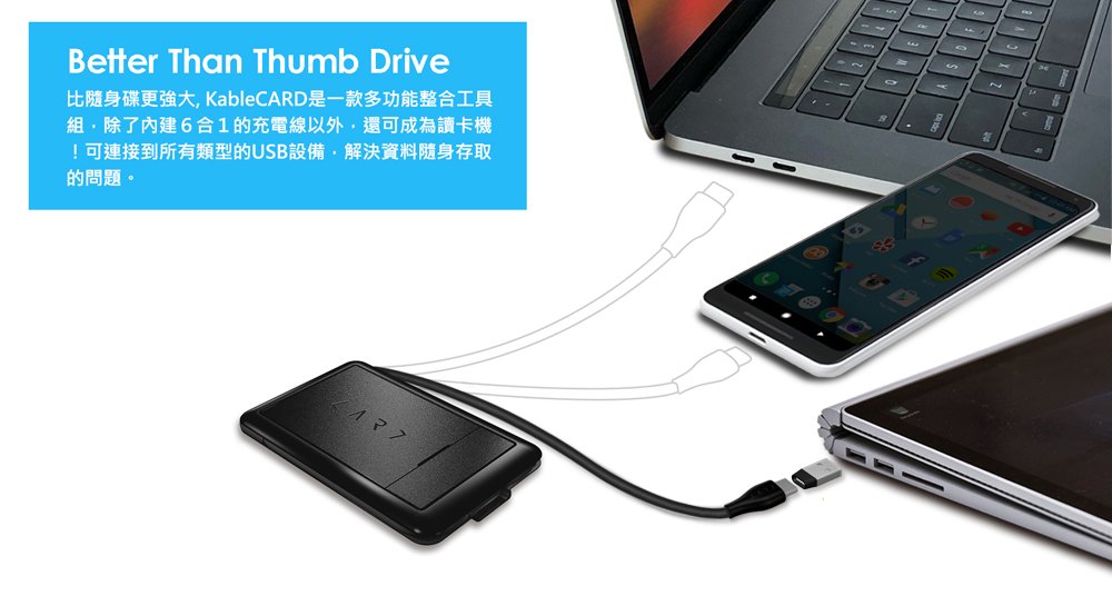 你能想像同時要帶6種充電線和無線充電功能的充電器嗎? 腦袋裏浮現的是否是雜亂、沈重、笨重又不方便攜帶的影像? KableCARD 提供給您另一個選項。