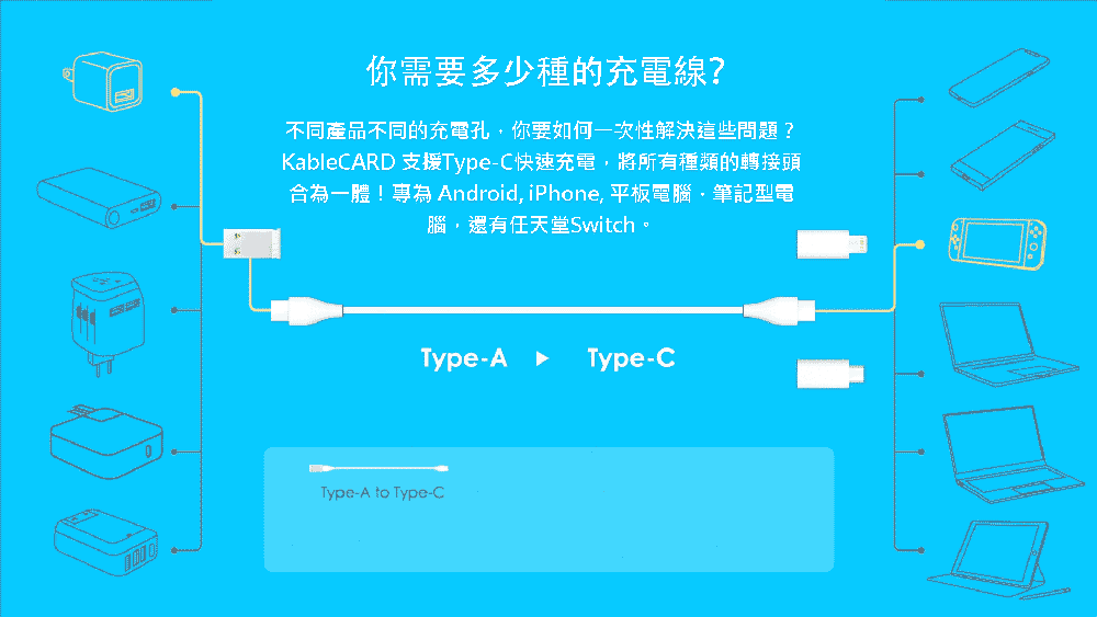 為什麼要選擇KableCARD呢? KableCARD 革命性的設計,集合了所有必須的常用的轉換頭,一條接近30cm的Type-C充電傳輸線,3種轉換頭,可變化成6種不同類型的充電線。只需卡片大小就可同時容納6種不同充電線。 競爭的效率就從KableCARD開始。