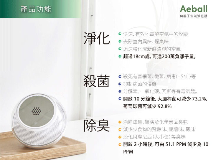 而 Aeball 最主要的三大任務是「淨化」、「殺菌」、「除臭」,利用剛才所提及負離子特性與殺菌技術,可以有效的電解空氣中的煙塵,快速去除室內的煙臭、霉味、食物腐臭味,還有各種揮發性有機化合物所散發出來的刺鼻臭味。當然重要的不只是味道被消除,還有更麻煩的細菌、黴菌,甚至是 H5N1 的流感病毒都經過實測是真的可以消滅,確保這些物質在電解過後,將不再傷害人體,顧及一時的舒適嗅覺,更為了長期的健康著想。(點我看檢驗報告)