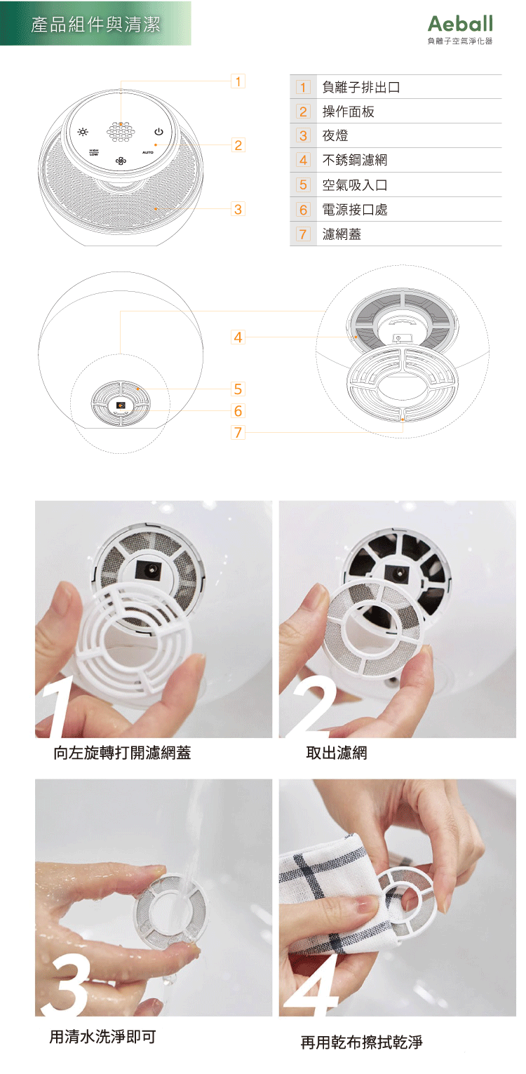 藉著「風扇模式」往下研究,大家可能會開始想問,關於空氣清淨裝置最容易被大家詢問到的問題,那就是「濾網」。在Aeball上頭當然也是可以找到,只不過跟傳統吸入髒空氣、排出乾淨空氣的空氣清淨機是不同的,因為 AICI 殺菌技術並非在機身內發生,而是從機器中排出負離子與有害物質結合並分解消滅,因此 Aeball 中的風扇是用來加速負離子有效擴散,而濾網則是用來避免灰塵吸入機體內的屏障,進而達到延長機體壽命的非耗材,僅需要在太多灰塵的狀態拆下清洗擦拭即可。