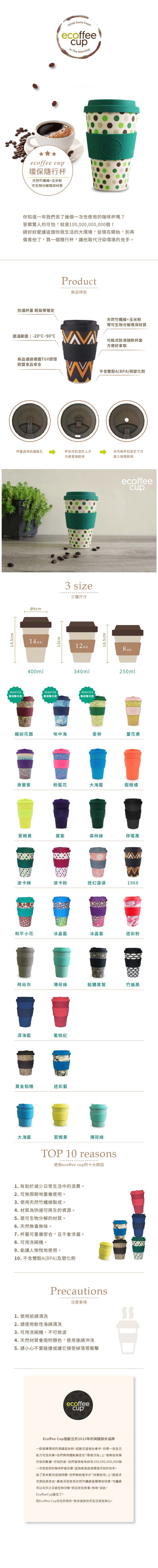 Ecoffee Cup品牌介紹Ecoffee Cup是創立於2013年的英國設計品牌。一群倡導環保的英國設計師,試圖在這個社會中,找尋一些自己能力可及的事。他們將問題點鎖定在「環境汙染」上,便開始收集汙染的數據,可怕的是,他們發現每年約有100,000,000,000個一次性使用的咖啡杯被丟棄,這些都是造成環境汙染的兇手。為了根本解決這個問題,他們開始著手於「材質使用」上,經過多次測試與改良,最後決定使用天然竹纖維這種環保材質,竹纖維可以百分之百被生物分解,而且安全無毒、無味,因此,Ecoffee Cup誕生了。而Ecoffee Cup存在的使命,無非是使你的生活更加安心。獎項:Best New Product (non-food) Biofach, Nuremberg, Germany 2017Best New Product (Green Lifestyle) SANA, Bologna, Italy 2016Best New Natural Living & Home Product Finalist, Natural & Organic Products Europe, London 2016