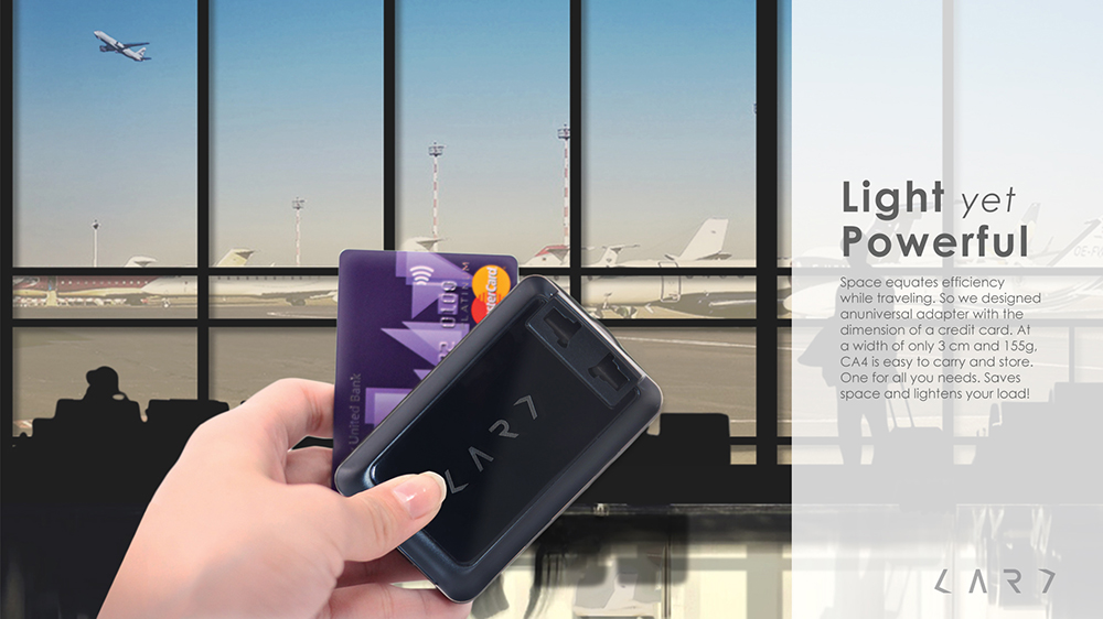 此外旅行中除了在意插頭是否適用,盡量減少行李重量與小東西的雜亂程度,這點也是相當重要的。因此維持輕薄的體積與厚度,一直是甲子團隊的重要設計精神,為了不辜負 CARD的品牌名稱,CA4-Pro 也努力瘦身,將體積縮小到僅有一張信用卡的大小,厚度雖然無法跟卡片一樣薄,不過也是相當理想的 3.2 公分厚,放在行李一點都不覺得負擔。