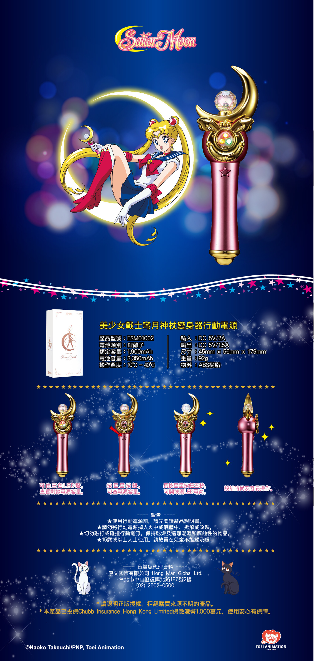 還記得那句話嗎?我要代替月亮來懲罰你!這是一句大家耳熟能詳的台詞回憶起當年,跟同學們的嬉鬧,拿著鏡子或小木杖,模仿動畫裡的動作,現在,你可以拿到動畫裡變身的道具了!使用方法:智能電源顯示備有三個LED顯示燈,讓你知道電源容量。長按星星按鈕五秒,可開或關LED手電筒。初次充電時間為12小時。初次充電後,正常充電時間為3-4小時。![]()