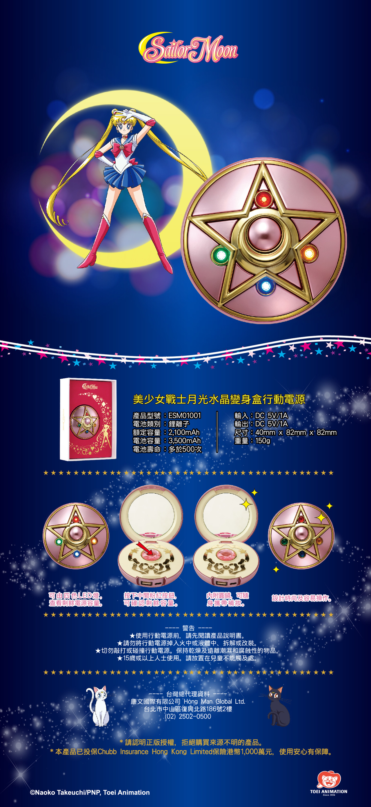 兼顧外型與實用性的美少女戰士行動電源,除了彎月神杖和月光水晶變身盒,相信有不少美戰迷在敲碗其他武器或變身道具造型的版本吧(月光公主權杖、螺旋月光神杖......)等待它們問世的同時,就用彎月神杖和月光水晶變身盒充電,念著變身口號,重溫一下少女夢吧~