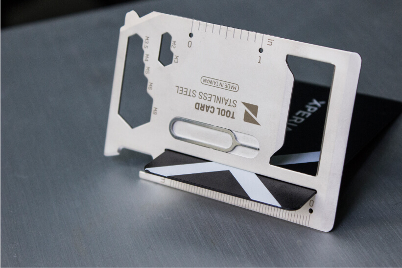 由 ZENLET 團隊設計的隨身工具卡,具有螺絲起子、六角扳手、開瓶器、尺等十餘種功能。材質做工毫不馬虎 ─以420不鏽鋼,經過 CNC 加工再表面熱處理製成 。大小僅與您的信用卡相同,可以收納於所有規格的Zenlet錢包或一般錢包中。