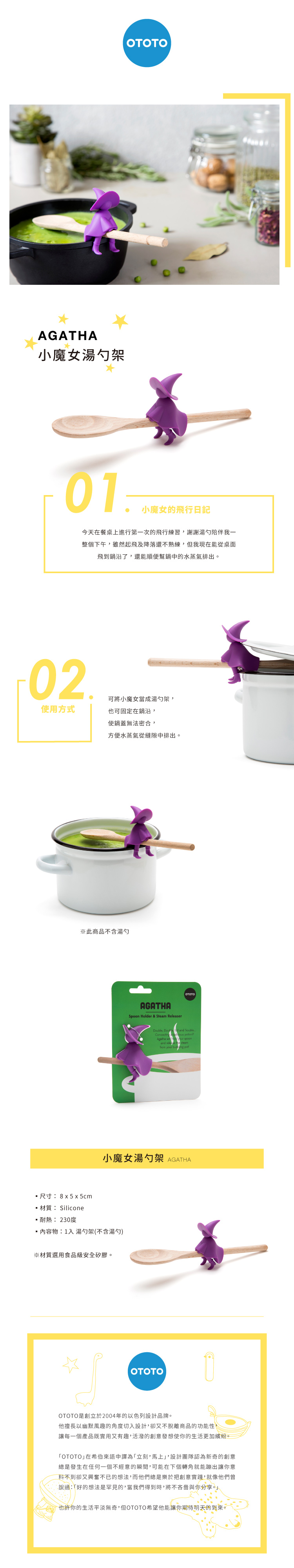 小魔女的飛行日記今天在餐桌上進行第一次的飛行練習,謝謝湯勺陪伴我一整個下午,雖然起飛及降落還不熟練,但我現在能從桌面飛到鍋沿了,還能順便幫鍋中的水蒸氣排出。※使用方式:可將小魔女當成湯勺架,也可固定在鍋沿,使鍋蓋無法密合,方便水蒸氣從縫隙中排出。※材質選用食品級安全矽膠,可耐熱230°C。※此商品不含湯勺。![]()
