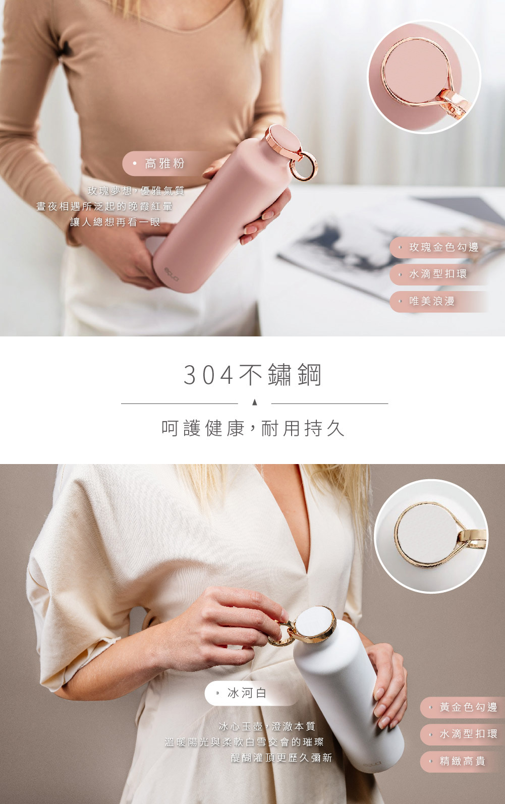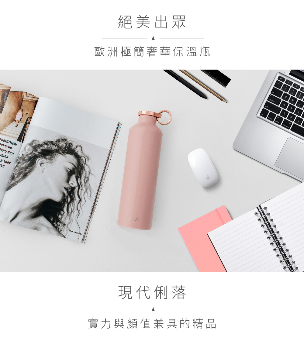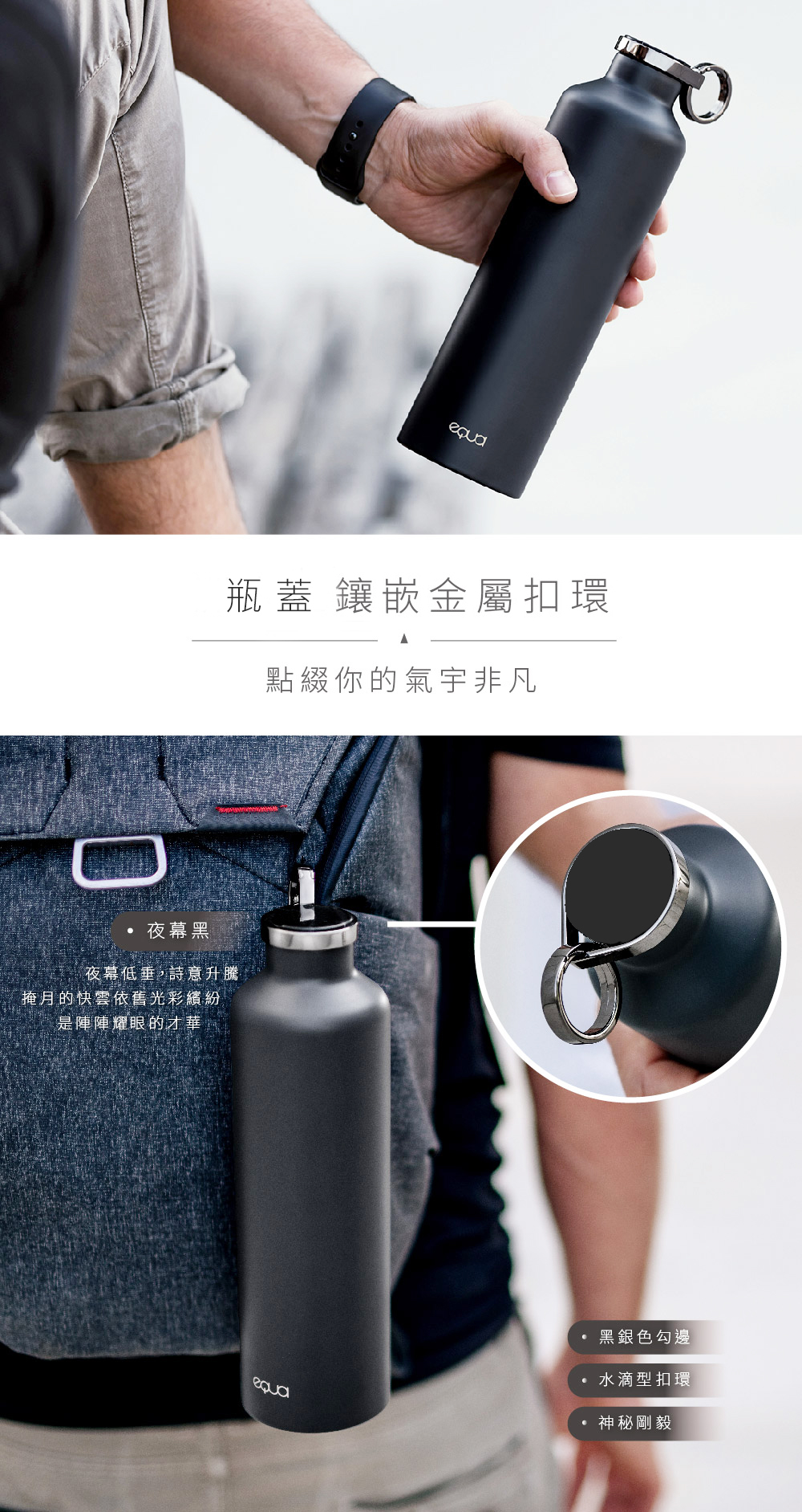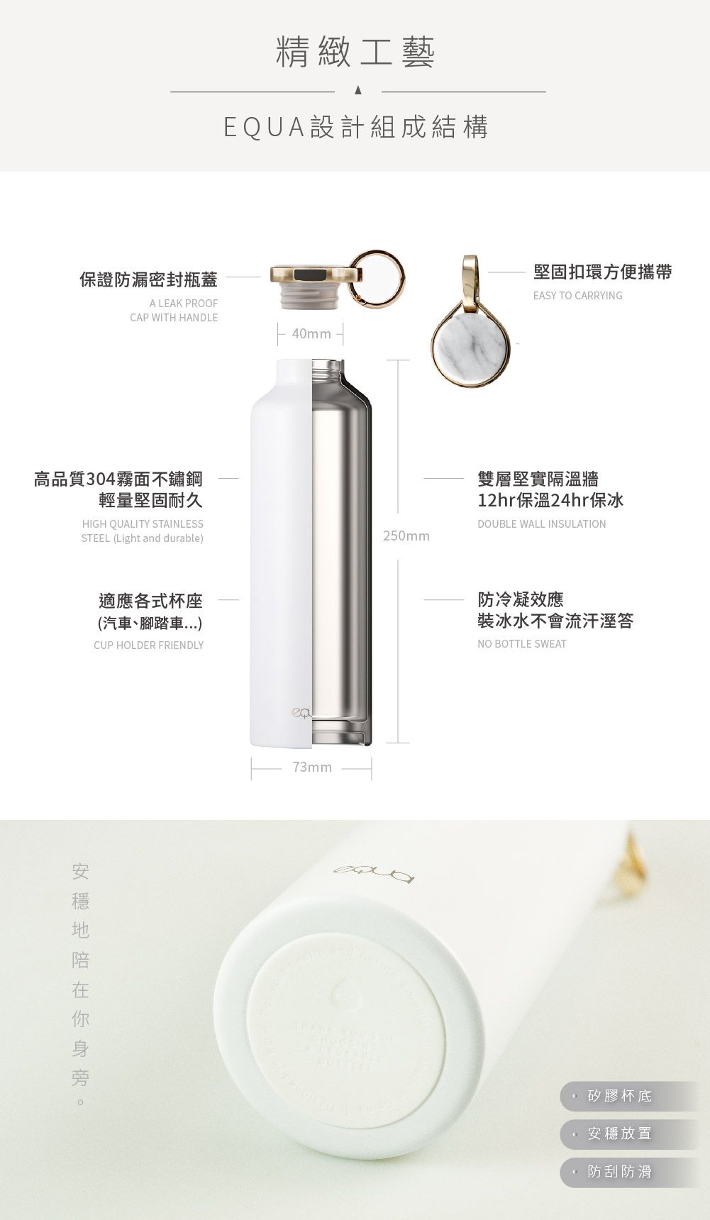 EQUA 團隊首度將天然純品義大利大理石鑲嵌在保溫瓶蓋上,不同色系的金屬扣環交相輝映,讓每一個保溫瓶都擁有獨一無二的風格、愛馬仕的氣質,俐落的線條更顯高貴優雅,一推出就成為了許多國外網紅、名模曬 Instagram 美照的時尚配件,也造成許多亞洲各地與台灣的朋友敲碗等待。