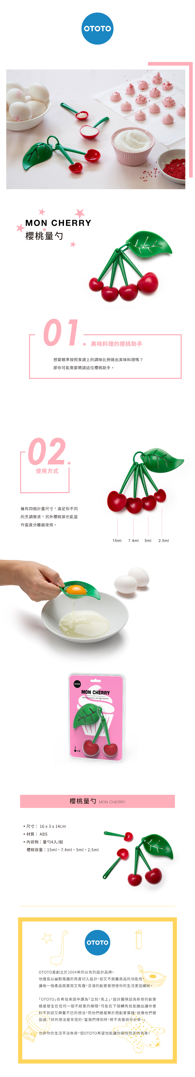 想要精準按照食譜上的調味比例做出美味料理嗎?那你可能需要聘請這位櫻桃助手,他擁有四個計量尺寸,滿足你不同的烹調需求,另外櫻桃葉也能當作蛋黃分離器使用。