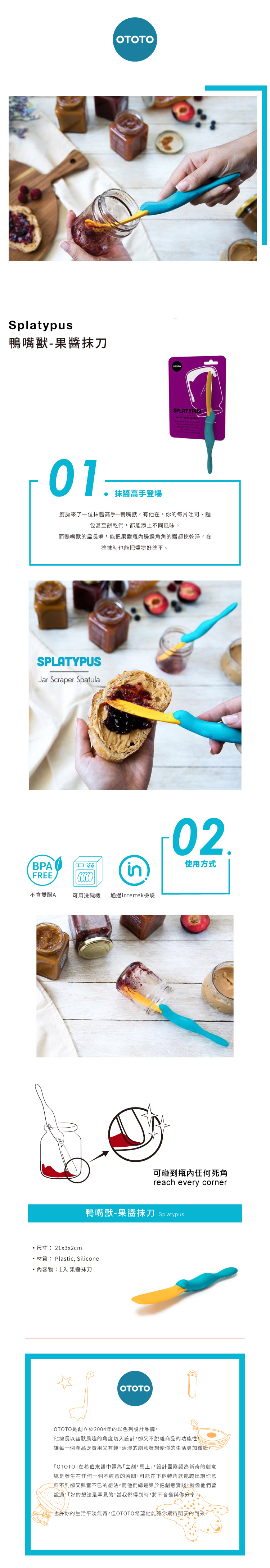 抹醬高手登場廚房來了一位抹醬高手--鴨嘴獸,有他在,你的每片吐司、麵包甚至餅乾們,都能添上不同風味。而鴨嘴獸的扁長嘴,能把果醬瓶內邊邊角角的醬都挖乾淨,在塗抹時也能把醬塗好塗平。※商品不含雙酚A(BPA Free),100%食品安全,且經歐盟食品安全,並通過intertek檢驗合格,可安心使用。※可用洗碗機,不可微波。![]()