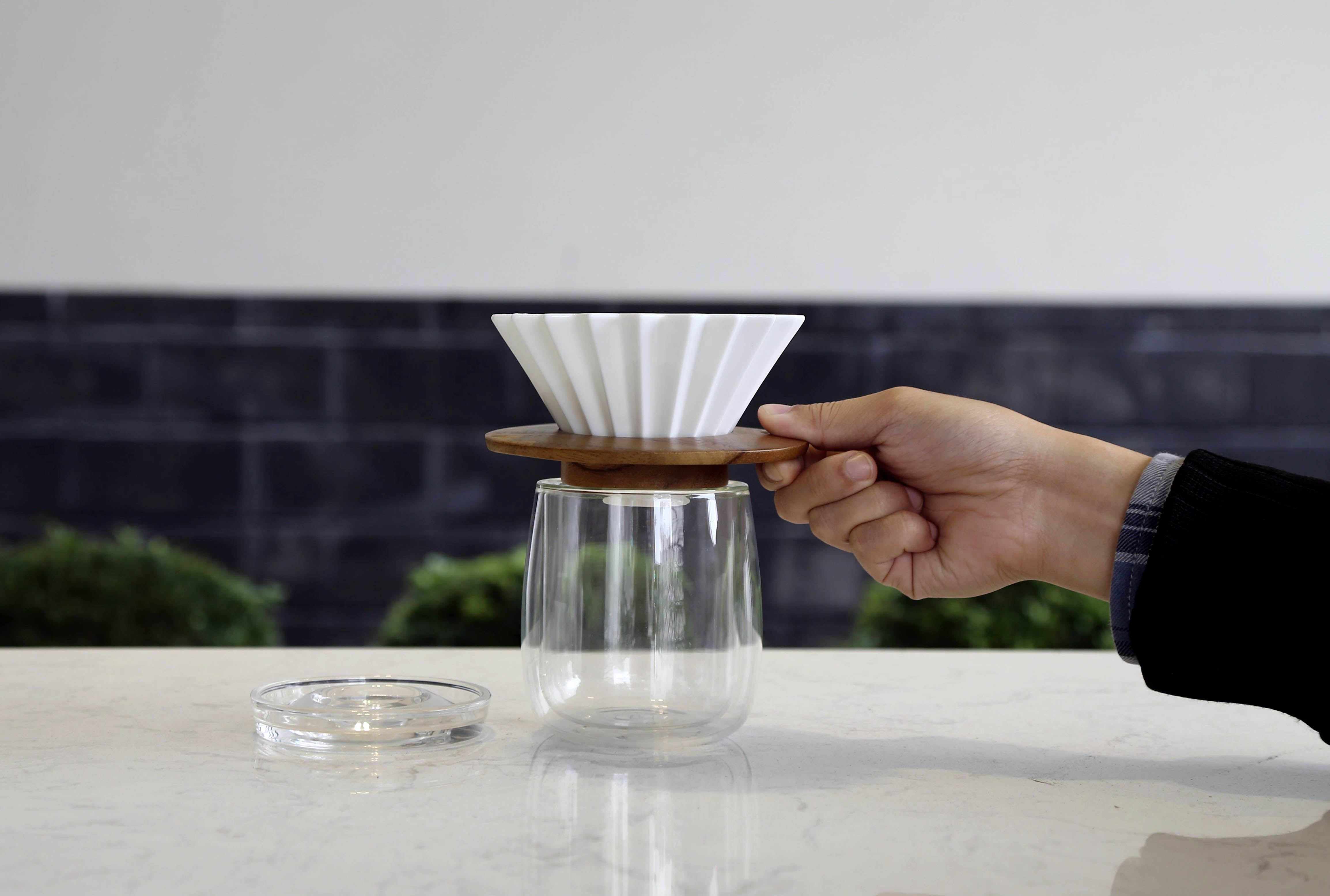 而同樣是雙層玻璃材質製成的杯蓋,除了可以加強保溫效果,還還融入了設計巧思,將杯蓋翻轉過來便能化身成濾杯座,完善的收納剛沖煮好的咖啡濾杯。從此不用急著把咖啡濾杯拿去沖洗,也不用擔心它滴滴答答,弄溼弄髒整個桌面。