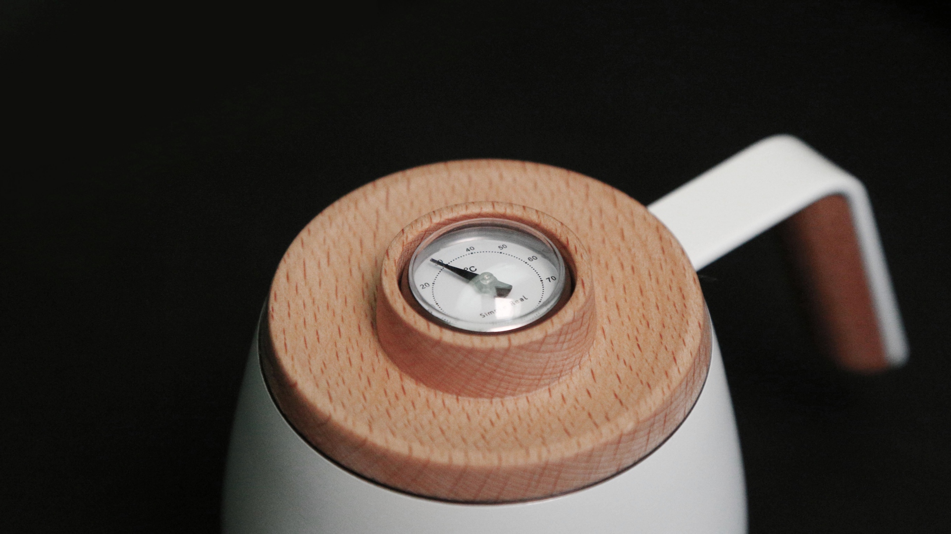 另外在天然原木製成的壺蓋上也有兩處設計巧思,其一是安裝上內嵌式可拆溫度計,因為適當的水溫才能穩定萃取出最棒的咖啡成分,無論是對咖啡新手,或是專業的咖啡師來說都是相當重要的環節。而第二點則是考量原木遇水容易變形發霉的缺點,於是設計師在原木壺蓋底下同樣以 304 不鏽鋼包覆,經過數月的實測驗證,每天使用也不會變形,自然也沒有發霉的問題,達到對衛生保障的要求。