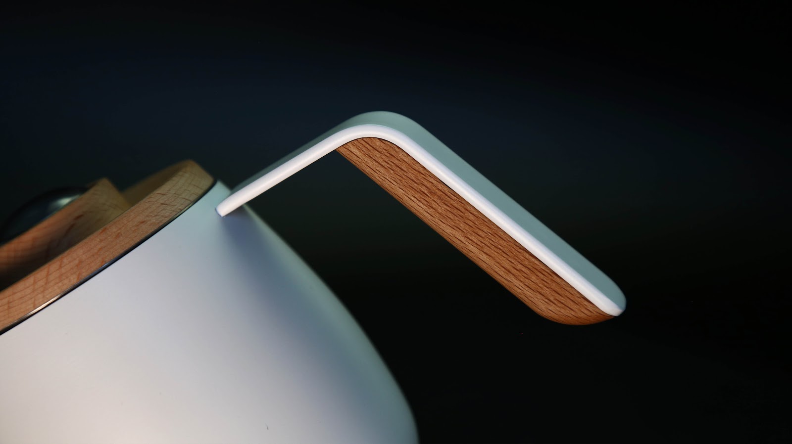 在外觀的部份,除了圓潤可愛的造型,以及溫暖乾淨的用色外,當然還有設計團隊精心規劃的天然山毛櫸握把、壺蓋、底座值得使用者細細品味。其中握把為了巧妙融合金屬與木材,呈現一體成形,並非強制結合的強硬感,設計團隊可是下了很多功夫,才將鎖點完全隱藏起來。更因為機械加工無法擁有最舒適的握感體驗,於是團隊選擇人工打磨來滿足對手感的追求,看來對於美感與手感,團隊可是一項都不肯放棄,兩種都想兼顧。