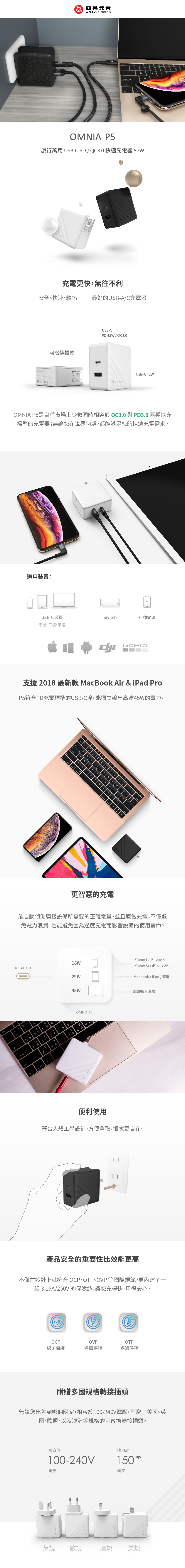 ・充電更快,無往不利安全、快速、精巧一最好的USB-A/C充電器OMNIA P5是目前市場上少數同時相容於 QC3.0 與PD3.0 兩種快充 標準的充電器;無論您在世界何處,都能滿足您的快速充電需求。・適用裝置USB-C 裝置:手機、平板、筆電、Switch、行動電源・支援 2018最新款 MacBook Air & iPad ProP5符合PD充電標準的USB-C埠,能獨立輸出高達45W的電力。・更智慧的充電能自動偵測連接設備所需要的正確電量,並且適當充電;不僅避 免電力浪費,也能避免因為過度充電而影響設備的使用壽命。・便利使用符合人體工學設計,方便拿取,插拔更自在。・產品安全的重要性比效能更高不僅在設計上就符合 OCP、OTP、OVP 等國際規範,更內建了一 組3.15A/250V 的保險絲,讓您充得快、用得安心。・附贈多國規格轉接插頭無論您出差到哪個國家,相容於100-240V電壓,附贈了美國、英國、歐盟、以及澳洲等規格的可替換轉接插頭。・替換不費力可替換轉接插頭,適用於全球超過150個國家;如此廣泛的適用性,不僅減少了您的行李重量,也幫您減少了發生窘況的可能。・兩色選擇、三年保固星光黑與晶光白兩種顏色可供選用、並提供令人安心的3年超長 保固;這款輕盈、便利安全的高效能USB-A/C充電器,正是您行 走全球無往不利的最佳夥伴。![]()