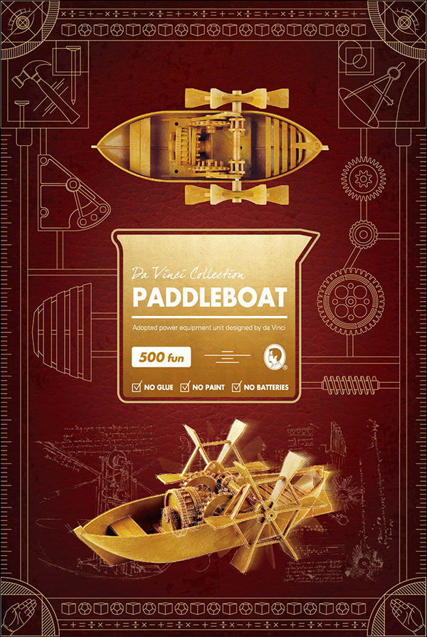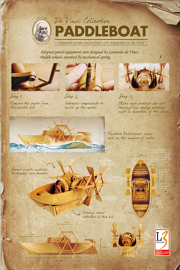 達文西設想了一種不依賴船帆的小型船隻,其前進的動力是來自於兩側的槳輪,雖然水輪推進的概念不是由達文西發起,但他是在15世紀促成此原理更加完整、明確的發明家之一!