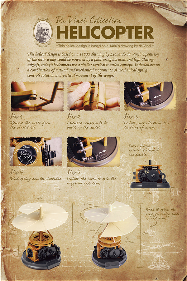 直升機展示了達文西的聰明才智和他對飛行的痴迷;轉子翼的操作可以透過駕駛員使用他的手臂和腿來驅動。
