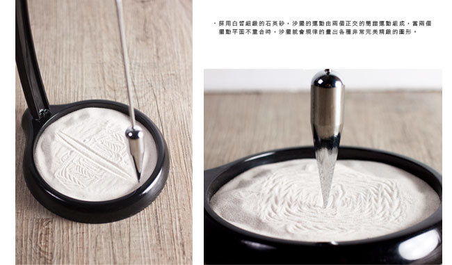 塑膠製39公分迷你尺寸,採用白皙細緻的石英砂,能畫出非常完美精緻的圖形,擺垂越短,擺動的也頻率越輕快。