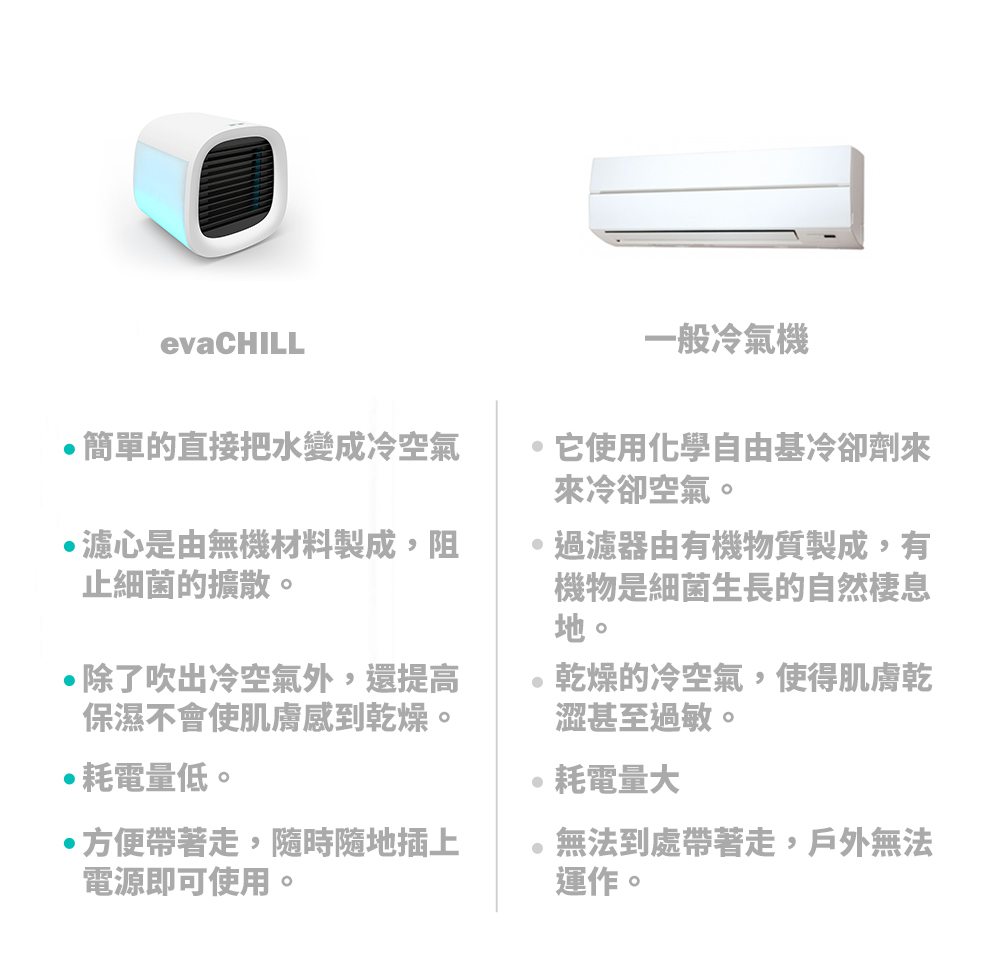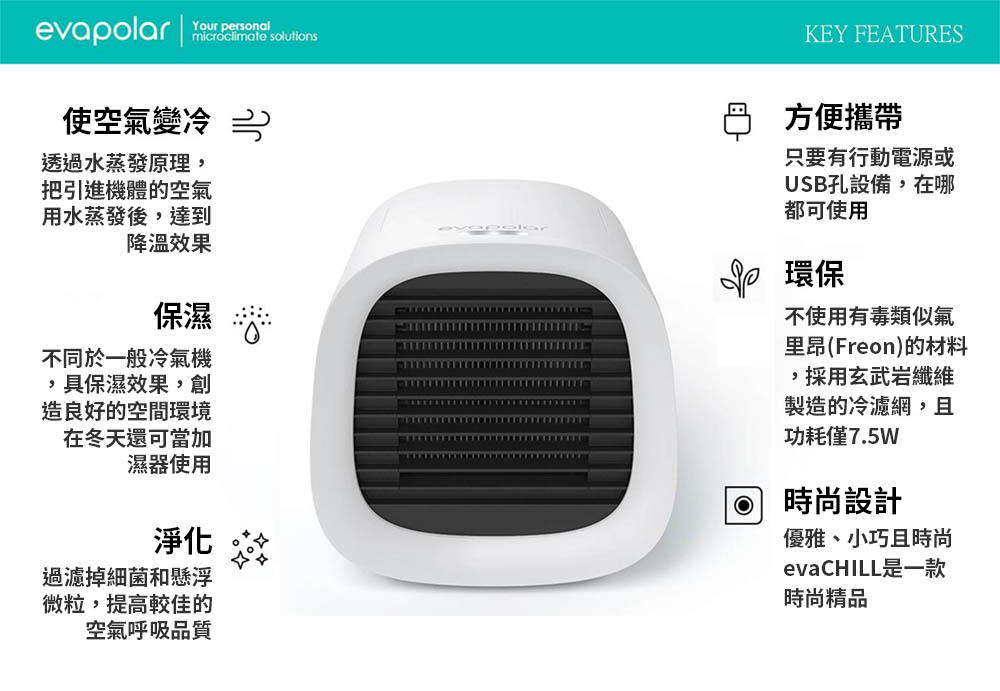 1. 簡單乾淨的製冷效果,隨時隨地都可使用的冷氣機。2. 功率小超省電,行動電源和有 USB 孔設備即可供電使用。3. 能增加空氣濕度具保濕效果,解決以往冷氣導致的皮膚乾燥問題。4. 濾心採用紙狀玄武岩纖維(basalt fiber),能達到抗菌除菌,淨化空氣效果。5. 專利 EvaBreeze 技術,水份蒸發效率更高。6. 不使用氟里昂(Freon)作為冷媒,不會污染環境。7. 適用於戶外活動、郊遊、運動、房間等地方使用。8. 符合歐美 CE , ETL 等認證,並榮獲 2018 德國 iF 設計大獎。![]()