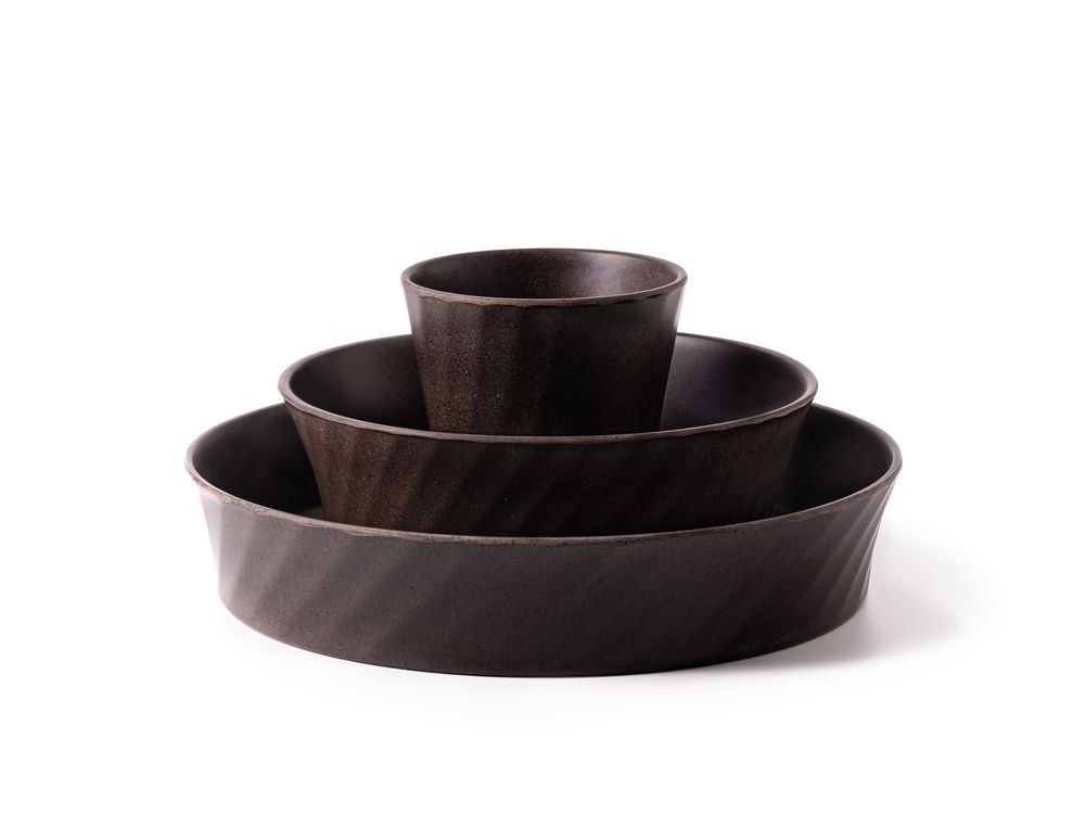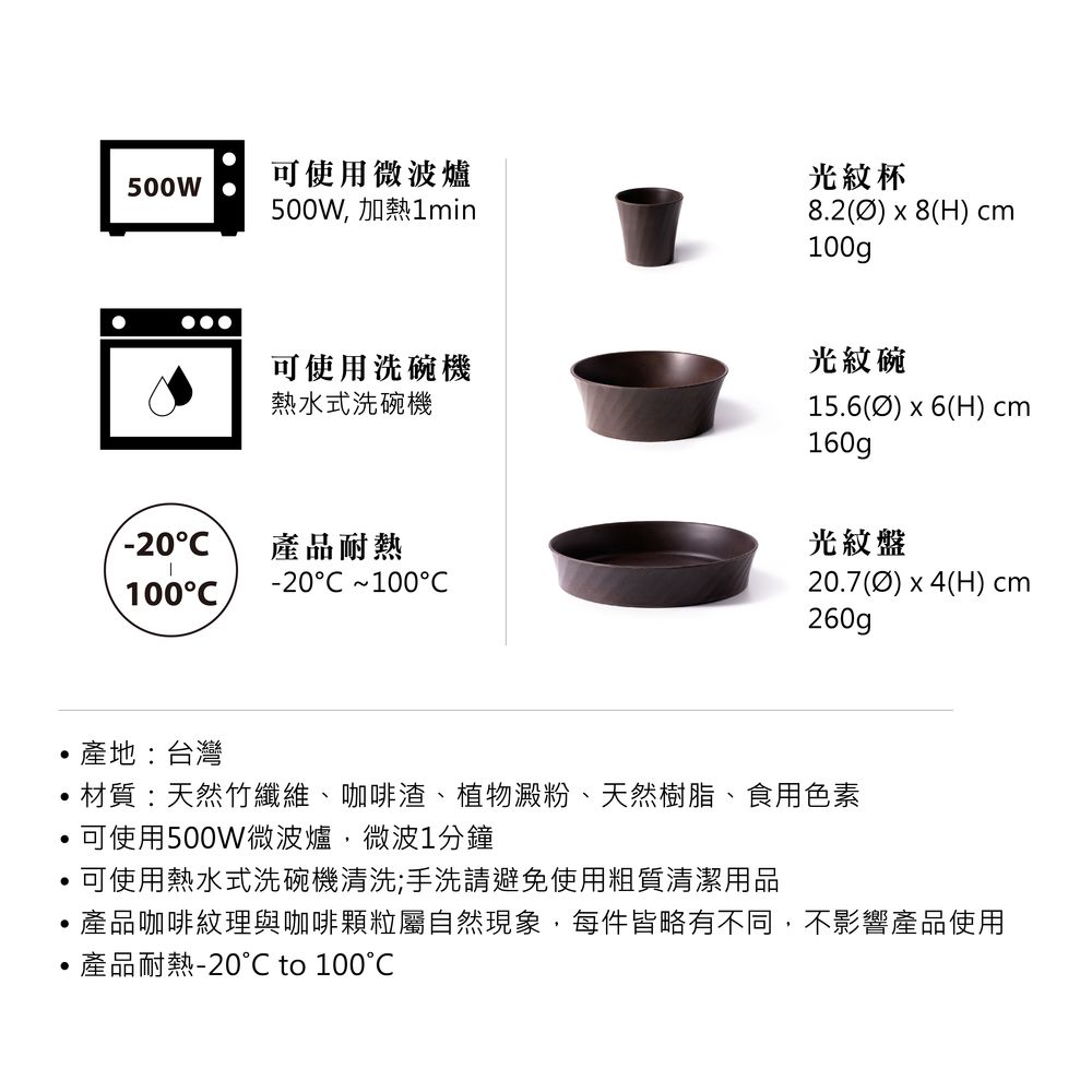 100%自然分解的竹纖維材質加上美麗的光紋造型與咖啡渣混色,讓日常餐食與戶外野食都能享受使用安心、友善地球、攜帶便利並且富有台式生活美學的完美餐具。