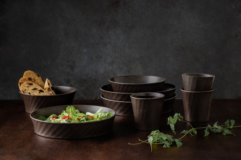 厝內竹纖維光紋系列的造型靈感源於對大自然的細膩觀察:將光線灑落的自然序列轉化為側邊紋理,讓手握著杯盤碗時多一份溫潤的手感;從底部而上逐漸外翻的有機線條,不但讓抓握符合人體工學,也讓就口的節奏更順暢。